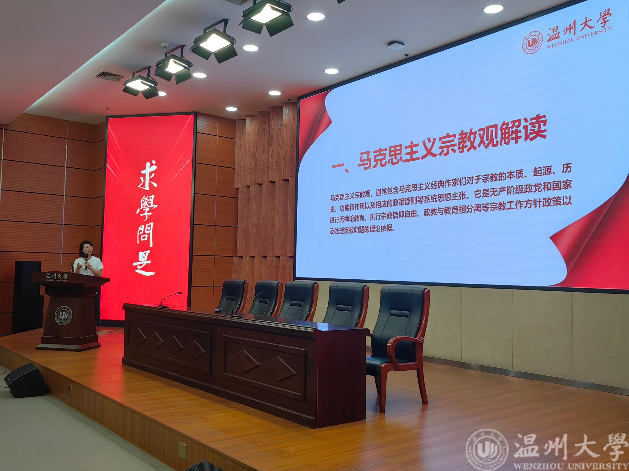 为全面贯彻新时代党的宗教工作理论和方针政策,拓展大学生形势与政策课内容,9月13日晚上,黑料网 于岩松堂雁山厅举办了一场以“马克思主义宗教观与党的宗教政策解读”为主题的专题讲座。学院党委书记陈文远老师担任主讲,全体新生到场听课。