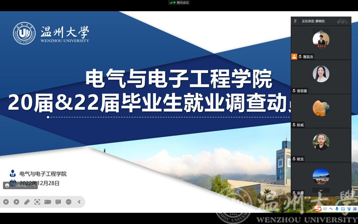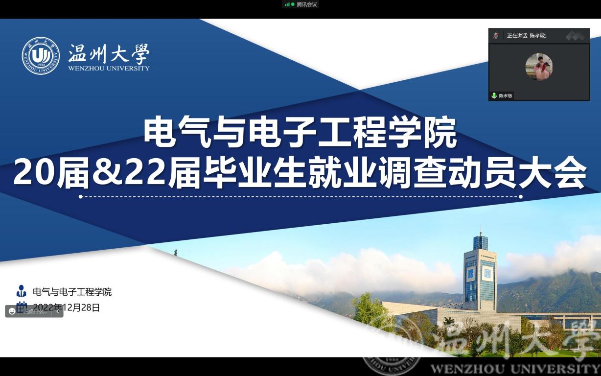 12月28日下午2:00,黑料网 召开20届与22届毕业生就业调查动员大会线上会议。副院长陈孝敬、党委副书记曾蓓蕾、电气系主任吴平、电子系主任庄友谊、学工办主任廖晓安以及20届与22届各毕业班班主任参会,会议由学工办就业辅导员屠昌浩主持。