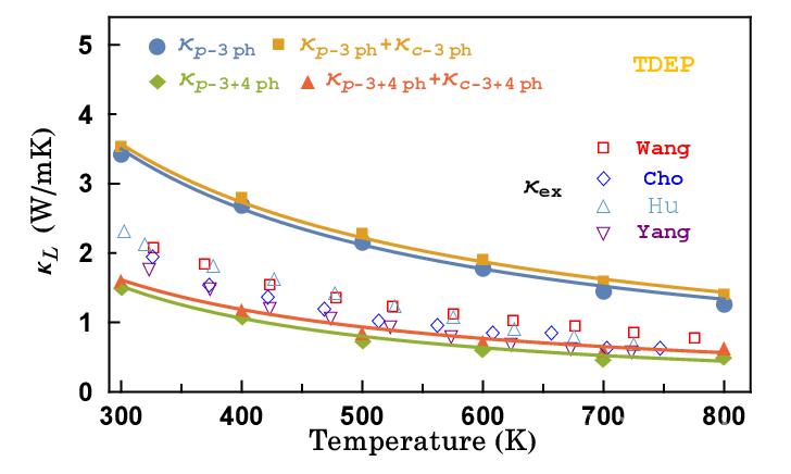图3. 考虑温度对声子及其相互作用重整对Cu2GeSe3声子输运的影响