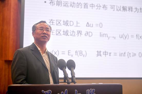 上午9:00,讲座准时开始。首先,陈大岳教授报告的题目是《浅谈布朗运动》。陈教授向同学们介绍了布朗运动的最初发现,并生动有趣的分析了布朗运动的物理意义以及其特有的数学性质,最后例举了一些布朗运动在金融方面的应用,如:股市的变化可以用布朗随机运动作解释等。
