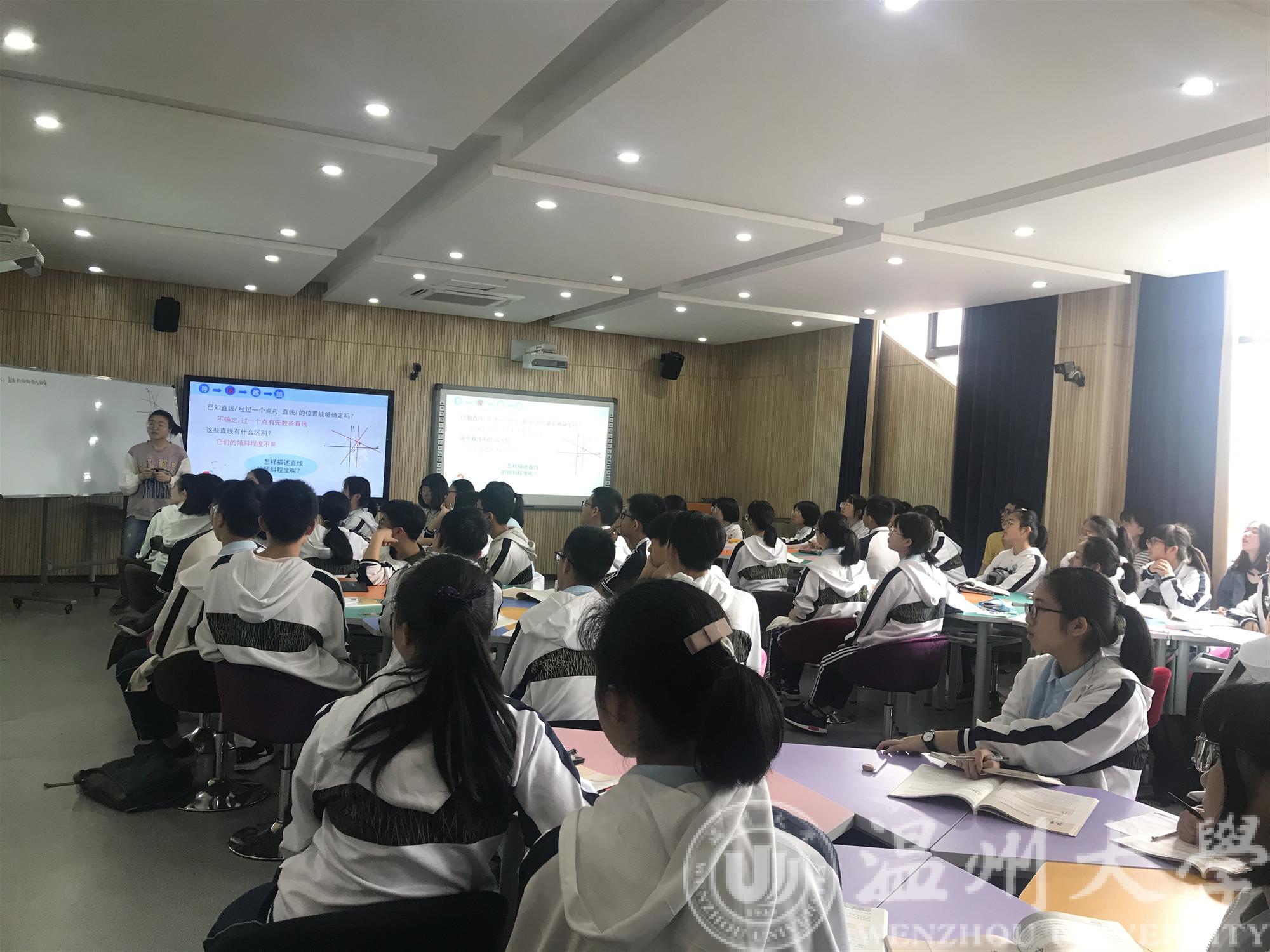在瑞安塘下中学,两位优秀的实习生同学杨秀和黄建刚为大家呈现了两堂精彩的公开课,为这次实习做最后的汇报。公开课后,塘下中学的领导和老师们为实习生开了一个意义深远的总结交流会,塘下中学的教导主任张池老师主持本次会议。