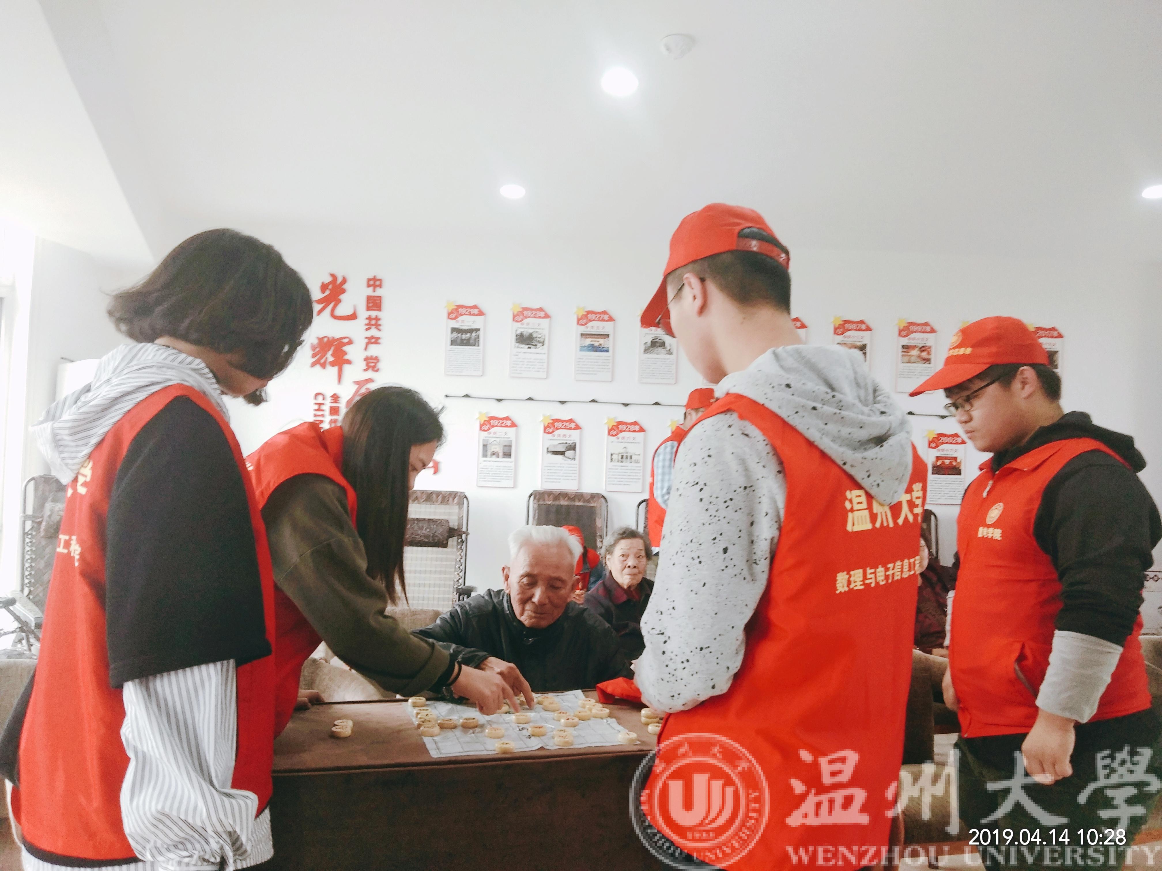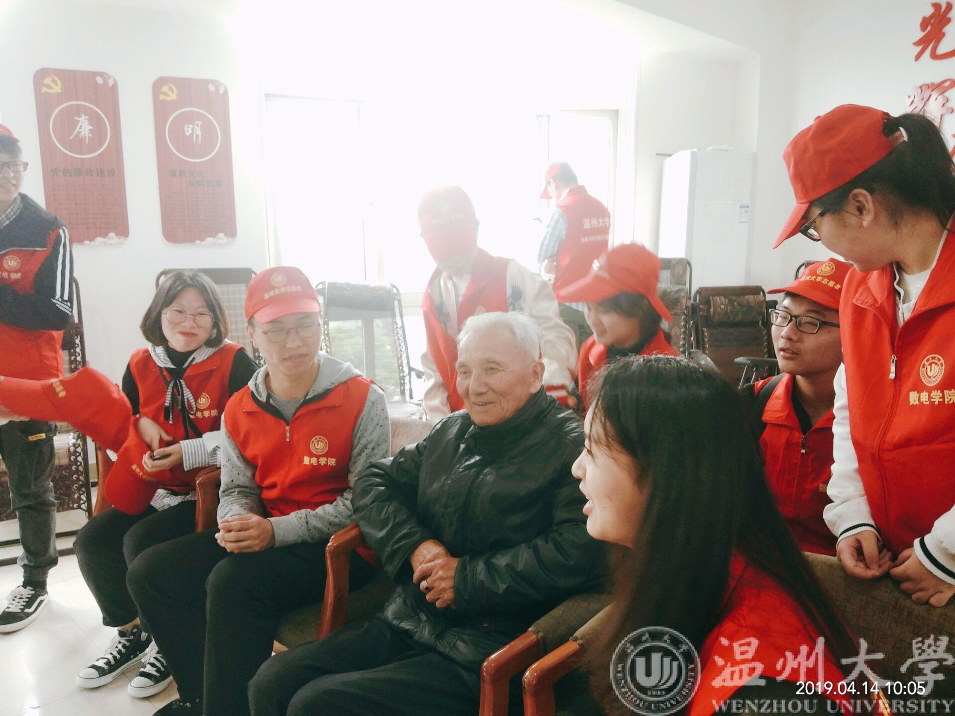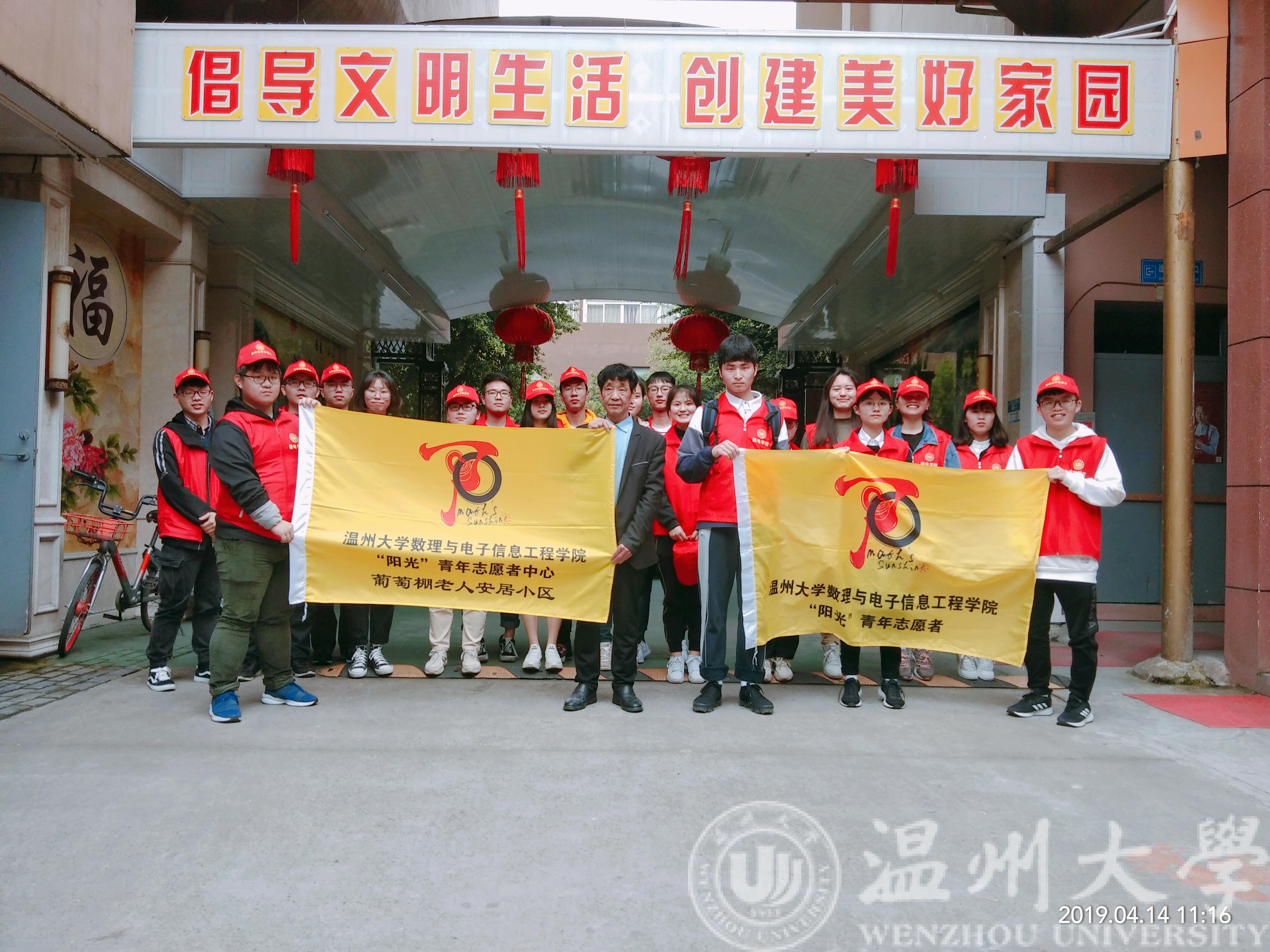 2019年4月14日,黑料网 数理与电子信息工程学院“阳光”青年志愿者中心组织了18电科1班的18名志愿者前往葡萄棚老人安居小区,为那里的老人送去了关爱与温暖。