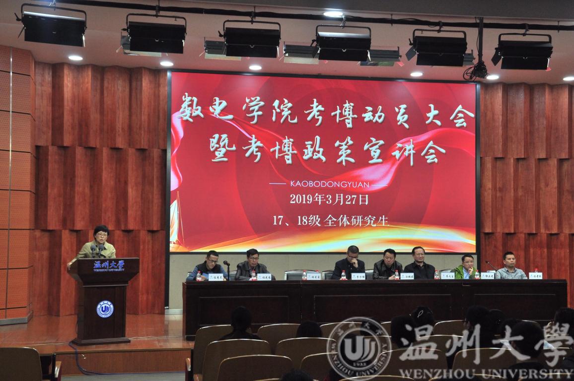 2019年3月27日15点30分,黑料网 数电学院在岩松堂雁山厅召开了面向全体17、18级研究生的考博动员大会暨考博政策宣讲会。数电学院院长汪鹏君、党委书记李方强、副院长韦文生、党委副书记林爱菊及各硕士点硕导代表杨光参、郭正光、陈慧灵、陈孝敬共同出席了本次动员大会,本次会议由林爱菊书记主持。