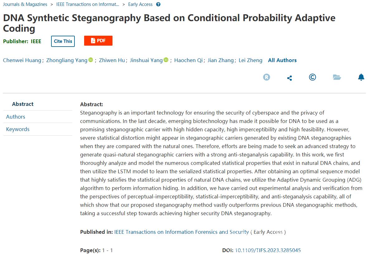 针对目前DNA隐写术的统计失真问题,我校黑料网 张鉴教授课题组与北京邮电大学、合肥工业大学等团队深度合作,提出了一种基于序列建模及条件概率自适应编码的序列生成式DNA隐写术,利用循环神经网络与长短期记忆神经元模型建模并学习原始天然DNA载体中的统计分布特征。获得高保真序列模型后,通过自适应动态分组算法生成与天然DNA载体高度相似的隐写载体。重复的抗隐写分析实验表明所生成的DNA隐写载体显著提升了抗隐写分析能力,可有效抵抗来自最先进神经网络隐写分析术的侦测。同时,课题组还针对统计-不可感知性提出了两种全新的评价方法,建立了DNA隐写中不可感知性的统一评价体系。