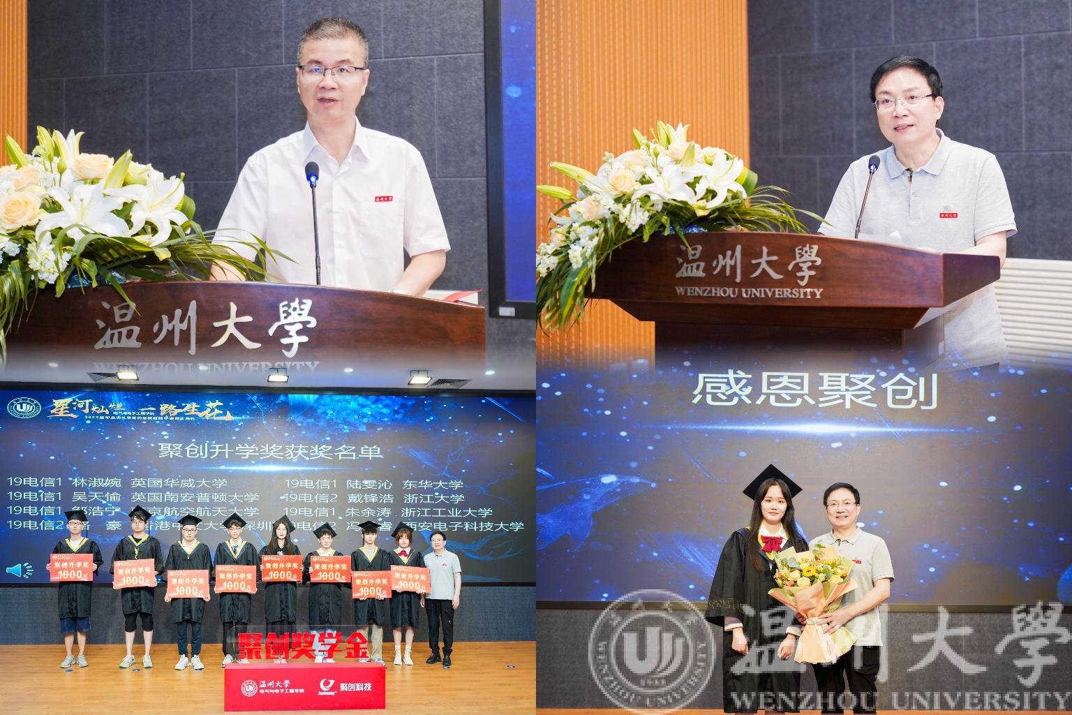 为表彰先进,在校友企业浙江聚创智能科技公司的赞助下,学院特别设立聚创奖学金。毕业典礼仪式上,学院党委书记李方强宣读了《2023年聚创升学奖奖励决定》文件及名单。聚创奖学金发起人吴桂初先生为获得聚创升学奖的68位毕业生代表颁奖。随后,曾担任学院学生会主席、成功考取西安电子科技大学硕士研究生的省优毕业生缪安琪同学为吴桂初教授献花并表达感谢。