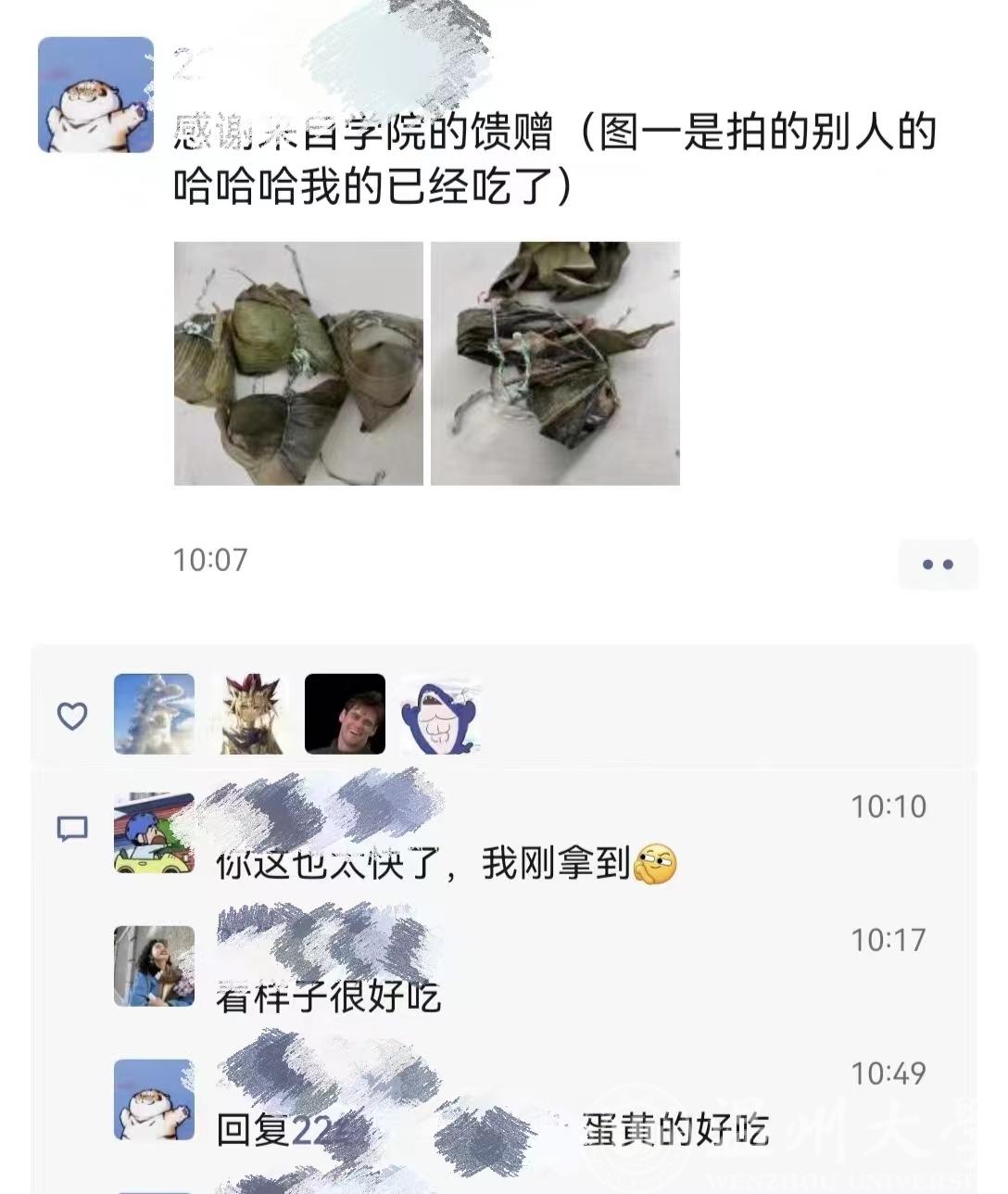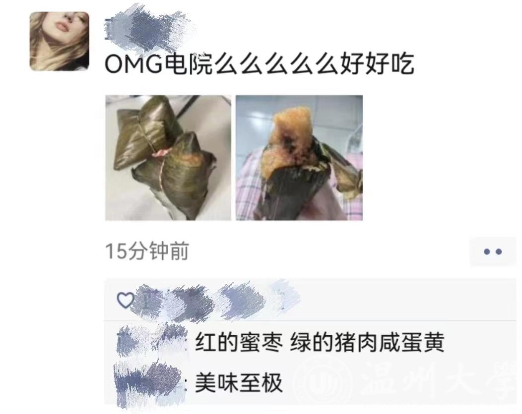“学院真的太贴心了!没想到端午节前就能吃到学院准备的美味粽子!”22电科2的蓝栀烨同学感叹。不少同学也纷纷在朋友圈晒出学院送的端午粽。