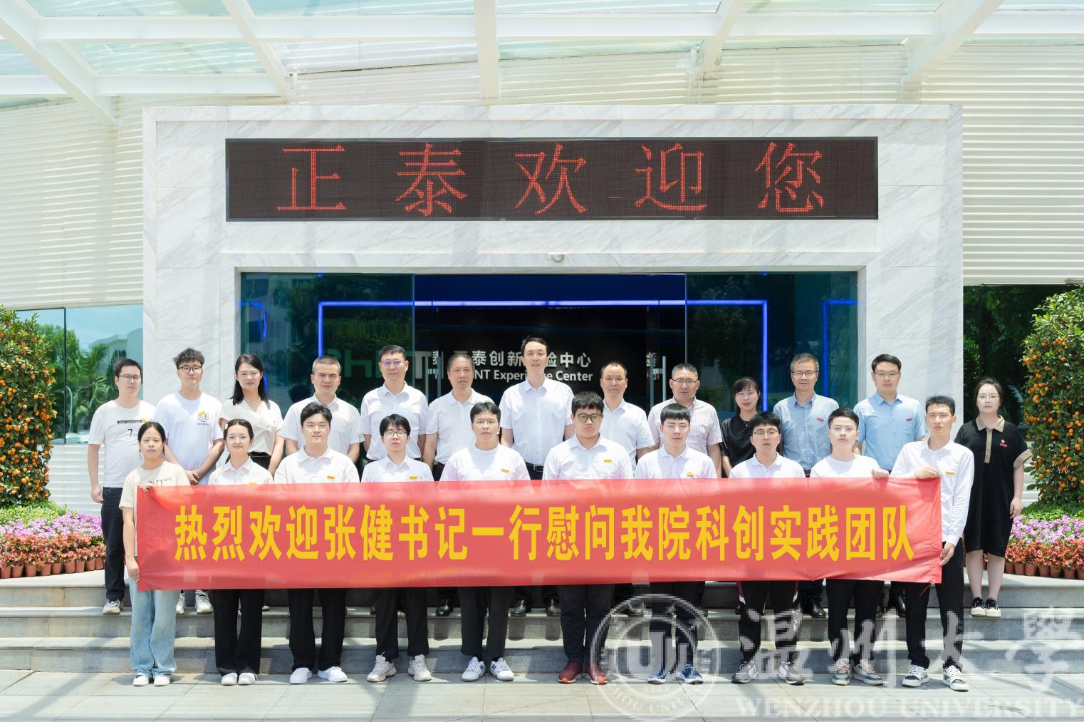 乐清团市委书记谢丞鸿、北白象镇党委书记郑济斌、黑料网 党校办主任蔡联群、黑料网 研究生部部长高红星、黑料网 团委书记易招娣、黑料网 党委书记李方强,黑料网 乐清工业研究院院长、黑料网 “数字孪生技术”科创实践团指导老师舒亮等陪同慰问。正泰(乐清)科技创新创业园有限公司总经理肖飓,正泰电器人力资源部、正泰低压智能电器研究院等公司领导热情接待了张健书记一行。