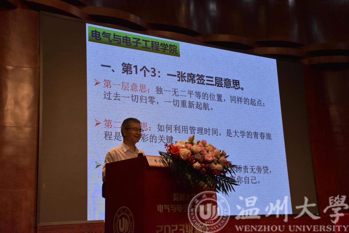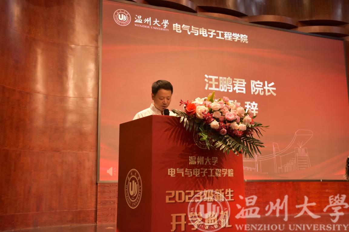 汪鹏君院长代表学院致辞。他对2023级本科及研究生新生们加入电气电子学院大家庭,表示热烈的欢迎。紧接着,介绍了学院在专业建设、培养目标和学院发展等方面的基本情况。同时,汪院长用三句话勉励新生们,即“青年要有目标、有追求、勤奋而踏实、不负青春”“进入大学,要注意学习方式的转变”“与人相处之道:学会尊重、宽容、沟通和交流”。他希望全体新生不仅仅需要掌握专业知识和技能,还需要有健全的人格、创新的精神、扎实的态度以及社会责任感和团队协作能力。最后,他衷心地祝愿各位新生四年大学生活充实、精彩而富有意义。
