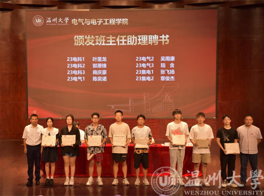 学院副院长朱翔瓯、副院长陈孝敬为各位新生班级班助颁发班主任助理聘书,并赠送纪念品,感谢班助的辛勤付出。研究生代表23电子信息专业任世茂、本科生代表23电科2班郑博文,分别上台代表研究生和本科生新生发言。