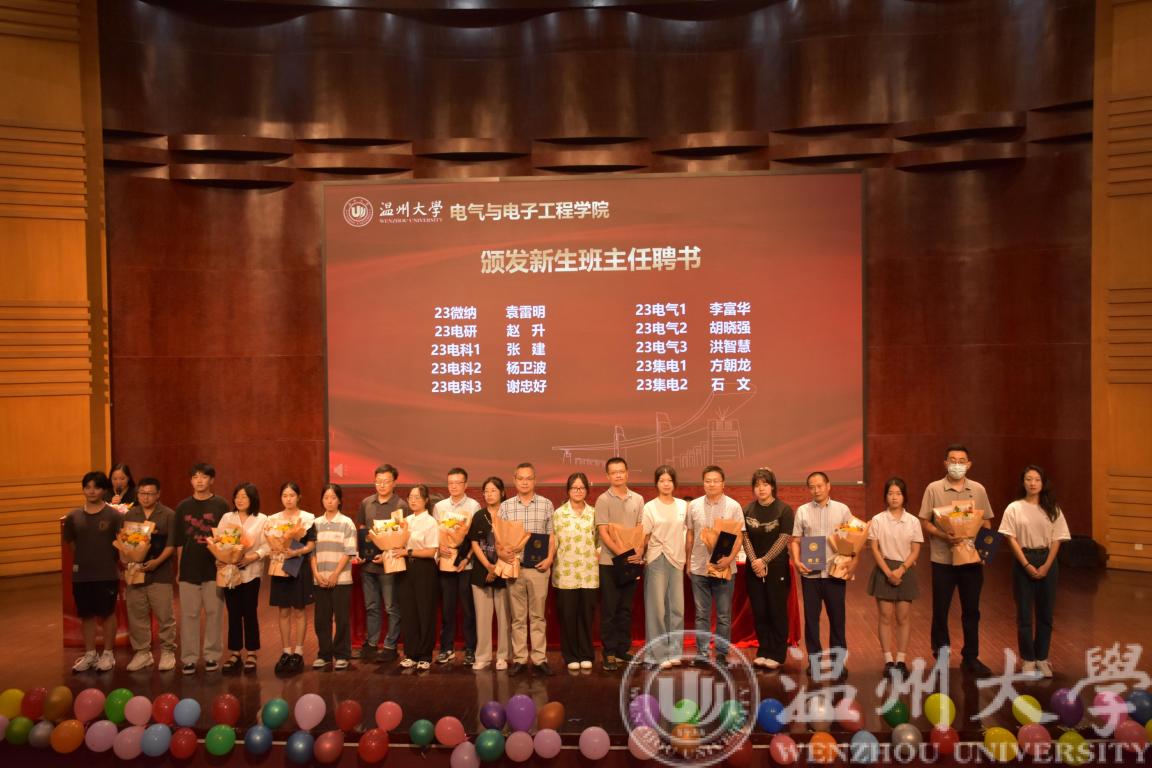 学院院长汪鹏君、党委书记李方强为23级新生班主任颁发班主任聘书。新生代表走上前台代表各自班级向班主任献花并行感恩礼。