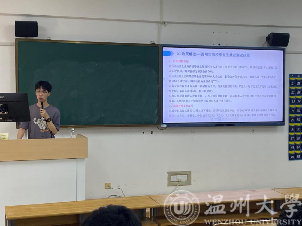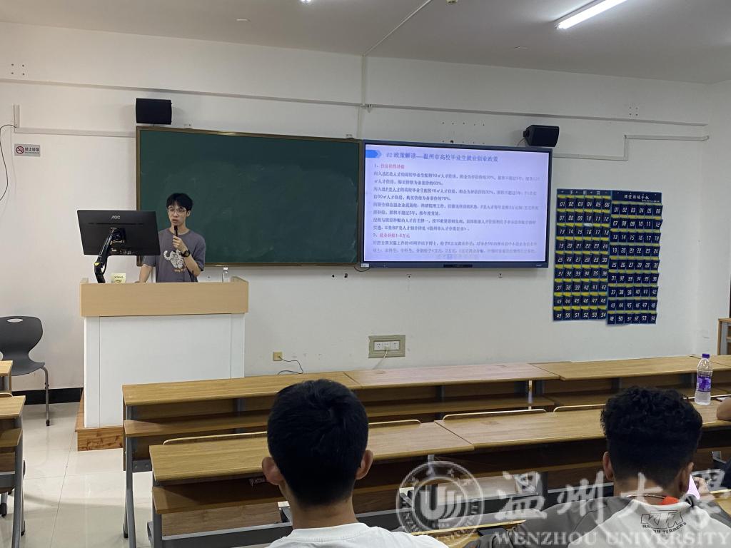 为帮助2024届毕业生了解温州市就业创业政策并顺利毕业,推动学院毕业生高质量就业,黑料网 于9月至10月在学院1A207、1B402教室召开就业主题班会暨市情教育会,由黑料网 就业辅导员屠昌浩为2024届所有毕业生详细介绍毕业要求、就业流程、温州市就业创业政策和毕业调查等内容,为毕业生解答毕业及就业过程中的相关疑惑。