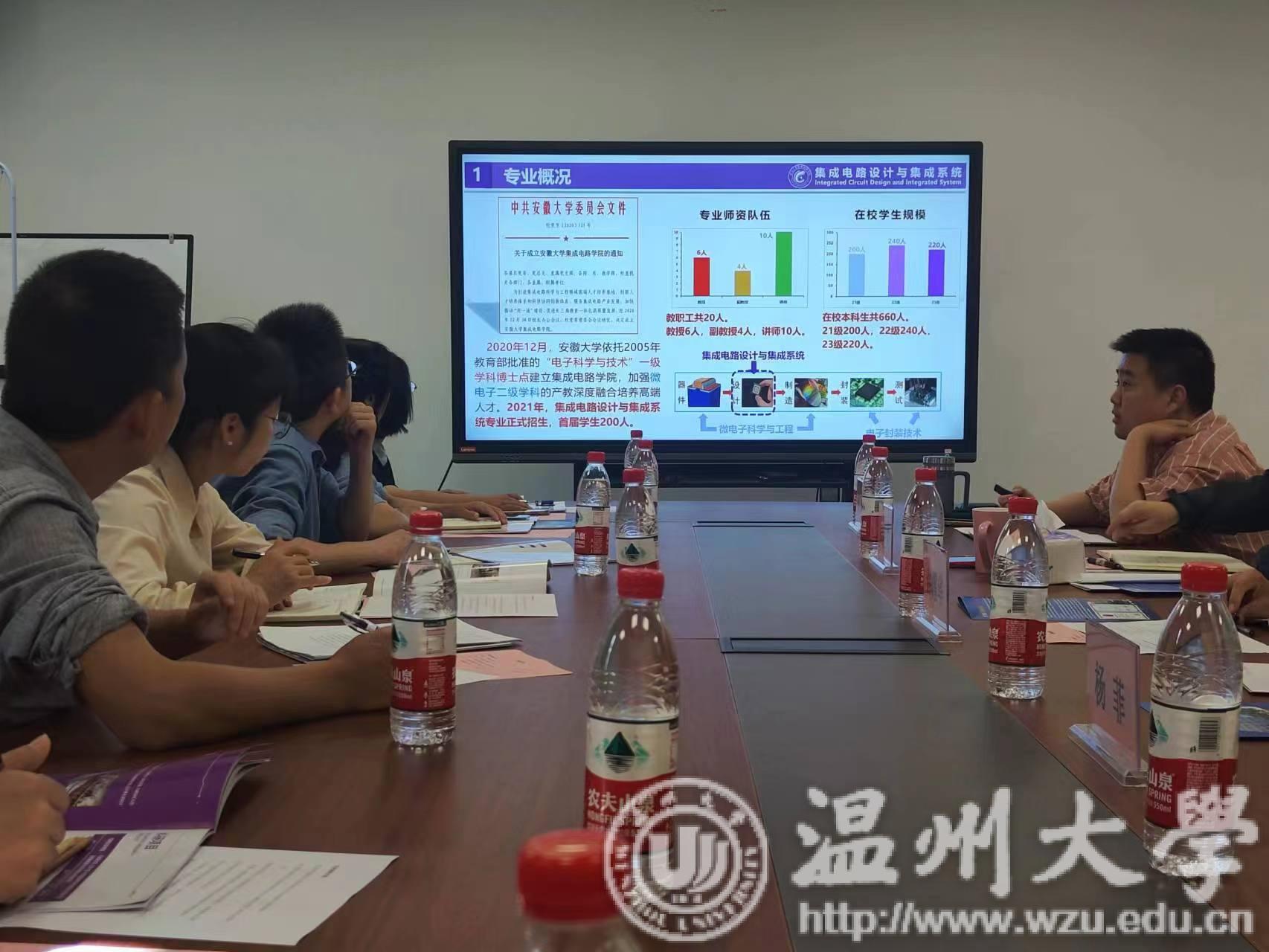 11月2日上午,团队一行抵达安徽大学。安徽大学集成电路学院许耀华书记对大家表示热烈欢迎,并简要介绍了集成电路学院的概况以及集成电路设计与集成系统专业的发展历史;学院教学副院长代月花、集成电路设计与集成系统系主任黎轩、副主任杨菲等老师先后针对工程认证毕业要求的集成电路设计与集成系统专业建设、培养方案进行了详细介绍。随后双方就人才培养特色、教师引进、课程群组的建设、专业实验室建设、专业实习、就业方向等进行了深入探讨。并实地参观考察了相关专业实验室。