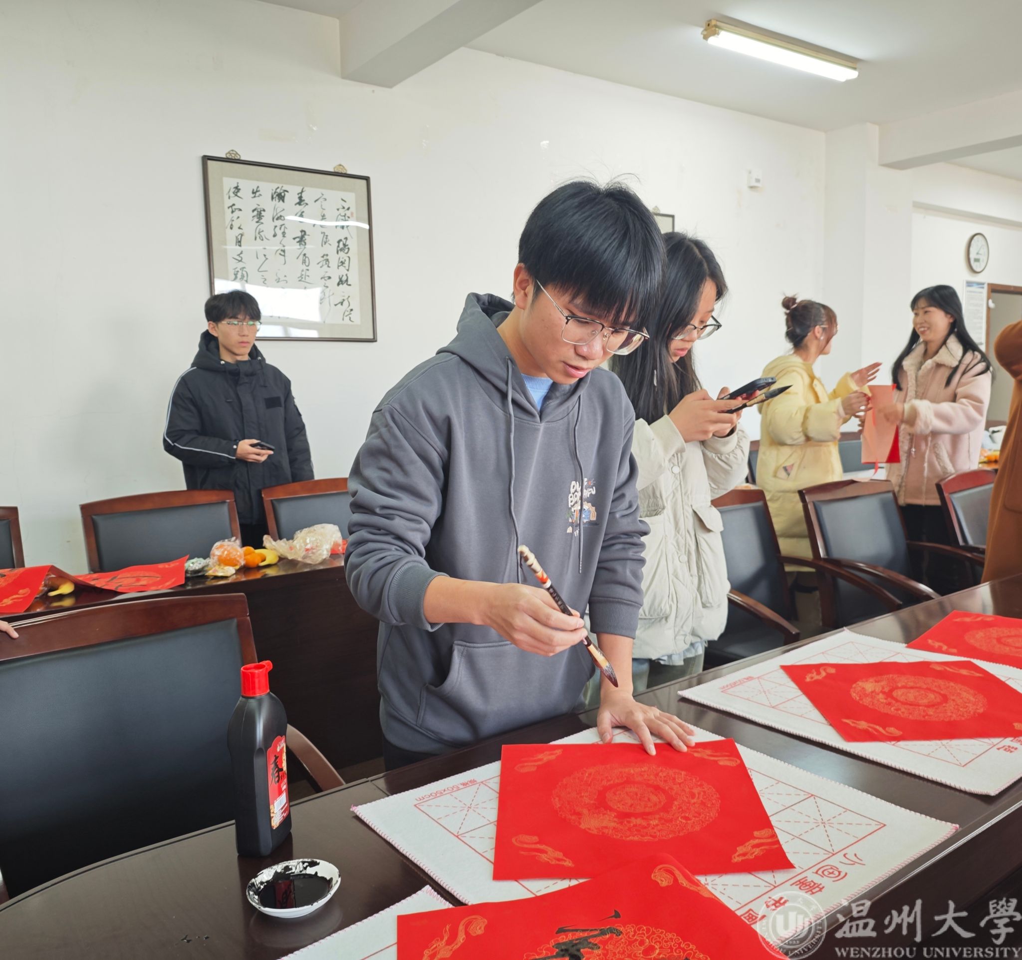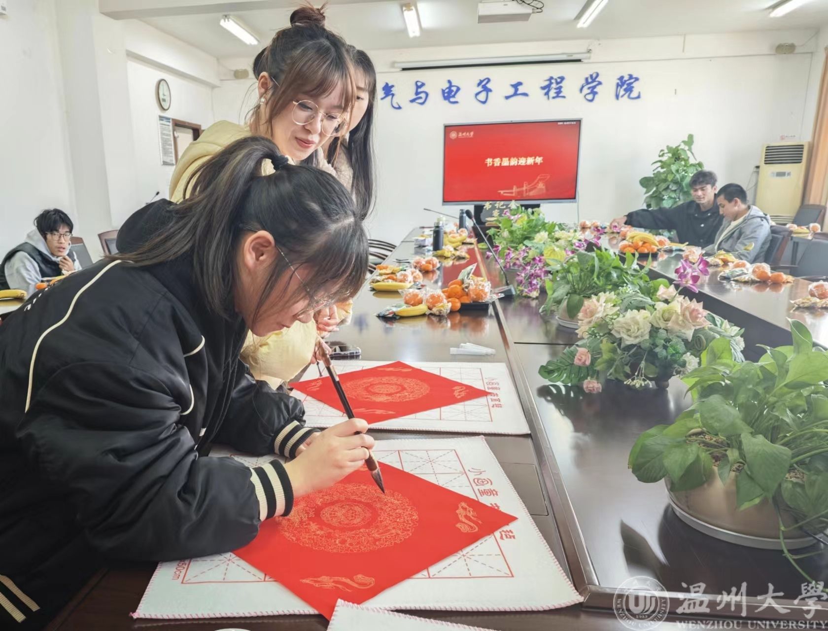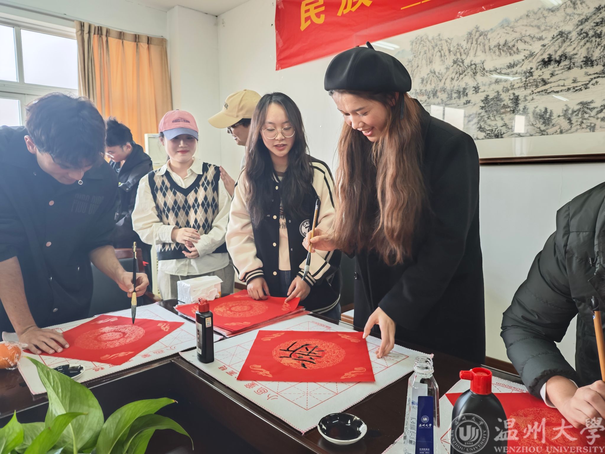 “笔走龙蛇舞翩跹,纸上韵律生云烟”,书法是我们中华民族文化的象征,具有深厚的历史文化底蕴和丰富的审美价值。本次活动还特别设置了“笔墨书新年”的环节,各民族同学欢聚一堂,大家纷纷拿起毛笔,挥毫泼墨,书写对新年的美好祝愿。活动现场洋溢着浓厚的文化氛围,同学们将新年的期盼和祝福都写进“新”字中。