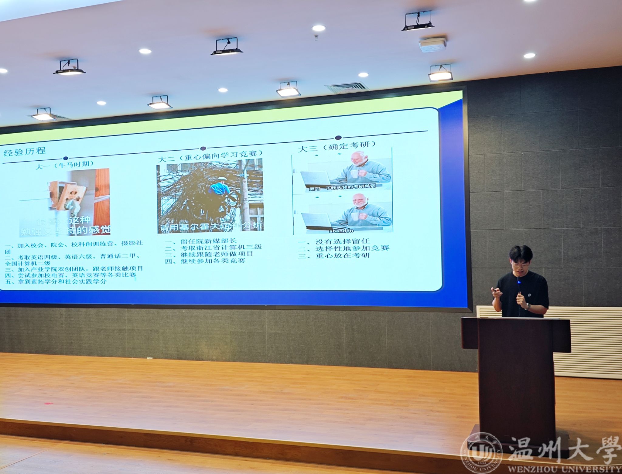 现任院团委学生会主席的章俊杰同学,介绍了自己从干事到主席的心路历程,介绍了如何平衡学习和工作,以及作为学生干部应该如何更好约束自己。