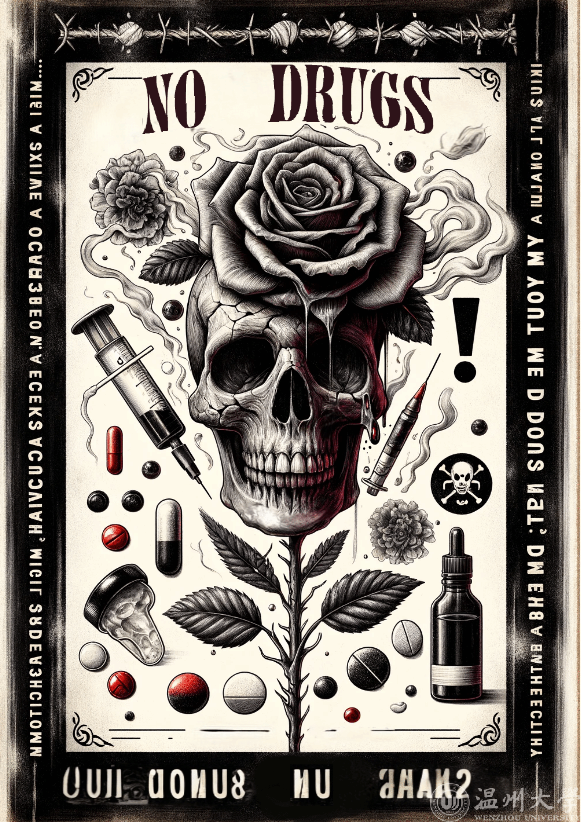 (生命之刺——23电科1班马浩。海报的设计通过这些符号和图案的有力组合,传达了一个清晰的信息:毒品危险,带来的是破坏和死亡,提醒人们远离毒品。)