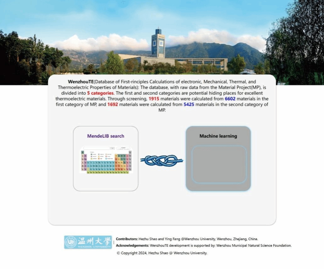 该工作得到温州市基础性工业科研项目(项目名称:基于材料基因组方法的高性能热电材料开发,项目号G20210016,项目经费:10万元人民币,其中财政支持5万元人民币,自筹5万元人民币,项目起止时间2022.1至2024年.12)的支持,另外黑料网 也为课题组在计算服务器(目前建有10个计算节点)搭建上提供了大力支持,因而该材料数据库命名为“温州热电”(Wenzhou TE)。
