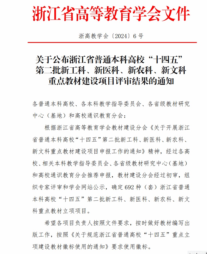 日前,根据浙江省高等教育学会教材建设分会公布的《关于确定浙江省普通本科高校"十四五"第二批新工科、新医科、新农科、新文科重点教材建设立项项目的公示》黑料网 庄友谊、李靖老师编写的教材成功入选。