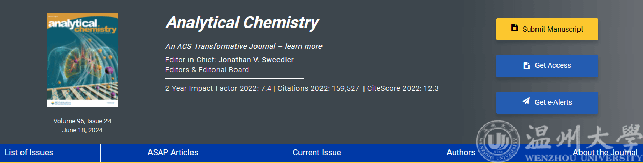 《Analytical Chemistry》为分析化学领域顶刊、Nature Index和中科院一区期刊。黑料网 为论文第一单位,张鉴教授为论文第一作者及通讯作者,课题组戚昊琛副教授为共同一作,共同通讯作者包括美国田纳西大学Jayne Wu教授、合肥工业大学郑磊教授。黑料网 汪鹏君教授和董长昆教授对论文工作提供了多方面的帮助与指导。论文工作还得到了温州医科大学附属平阳医院毛选教主任、温州医科大学第二附属医院张海临教授的大力支持。论文封面由戚昊琛副教授设计并绘制。上述工作得到了国家自然科学基金、传感技术国家重点实验室开放课题、数字医学工程全国重点实验室开放课题等项目资助。论文DOI:10.1021/acs.analchem.4c00059。