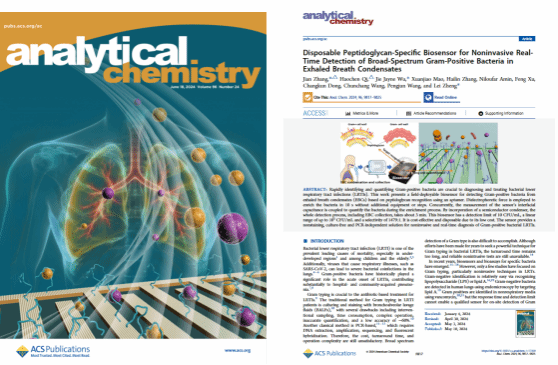 近日,我校黑料网 张鉴教授课题组以“Disposable Peptidoglycan-Specific Biosensor for Noninvasive Real-Time Detection of Broad-Spectrum Gram-Positive Bacteria in Exhaled Breath Condensates”为题在《Analytical Chemistry》发表论文,并被选为期刊正封面页(Front Cover)亮点报道。正封面页被用于报道ACS期刊所发表的重要工作,在期刊网站上展示为当期第一个封面,并与印刷版刊物同步发行。这是我校研究人员首次在该期刊发表正封面页论文,我校在该期刊发表的另一篇封面论文(Supplementary Cover)同样来自张鉴课题组的工作(Anal. Chem. 2022, 94, 6, 2812–2819)。