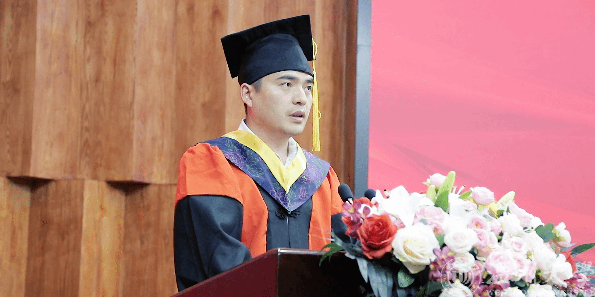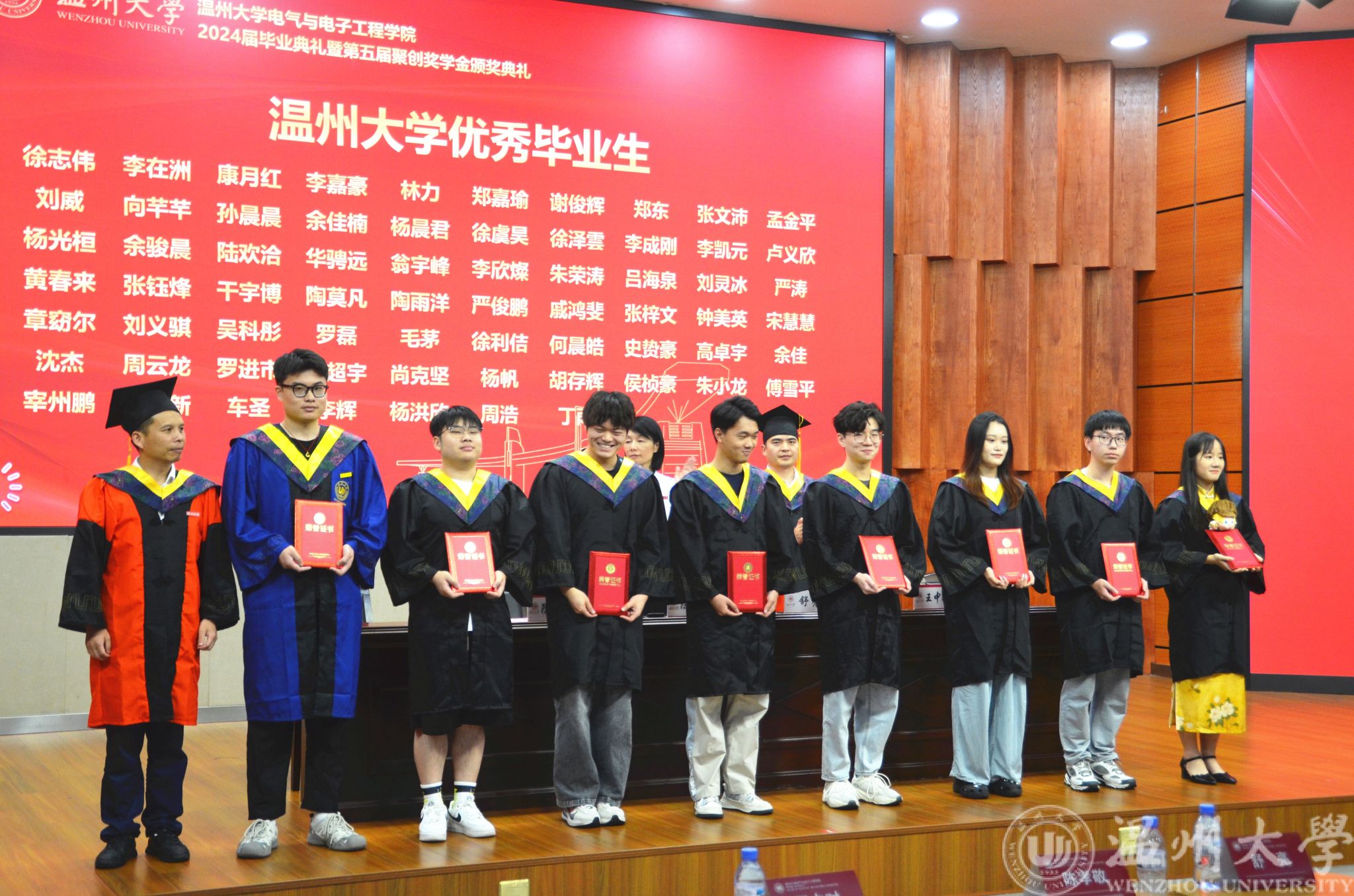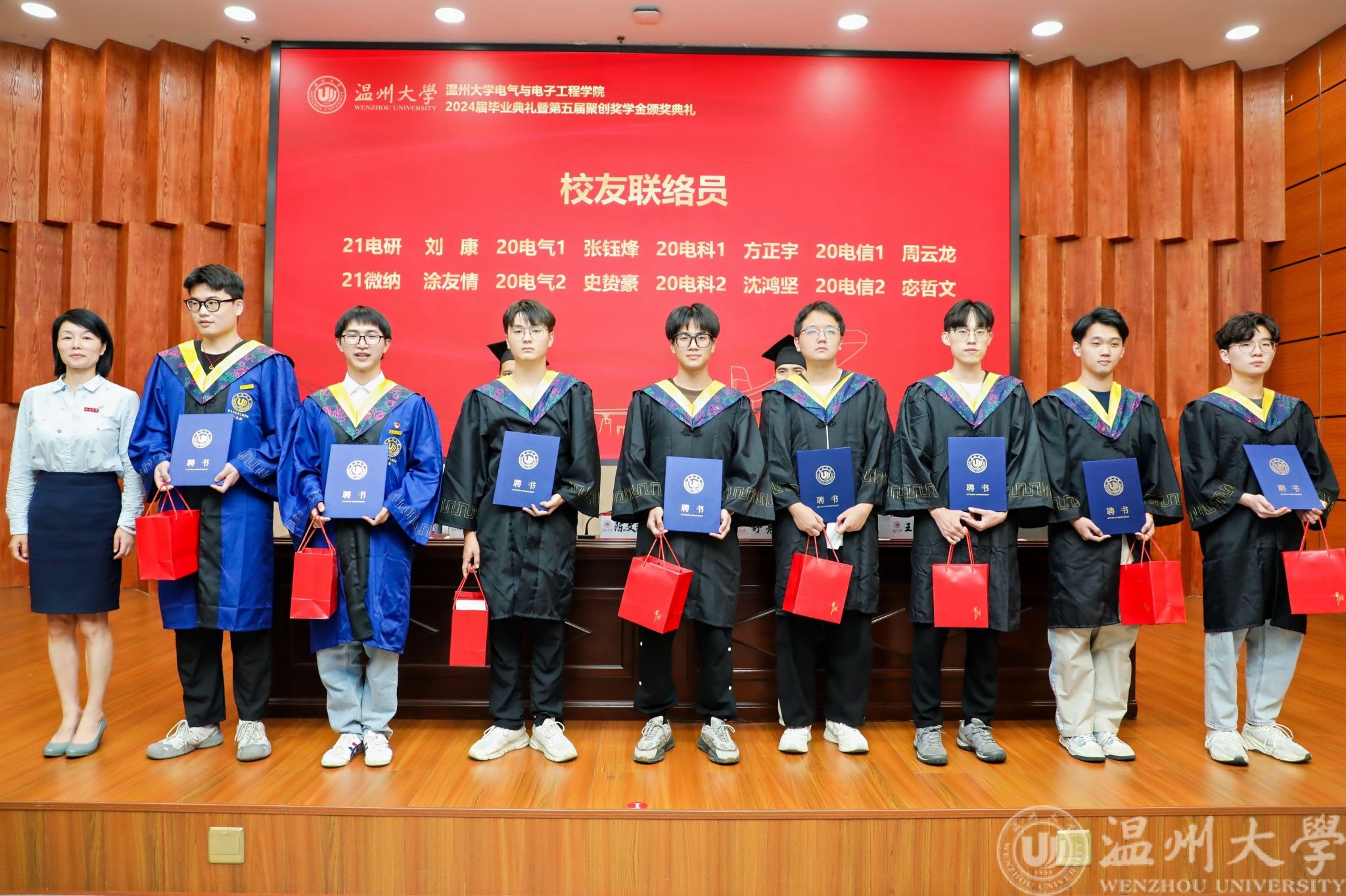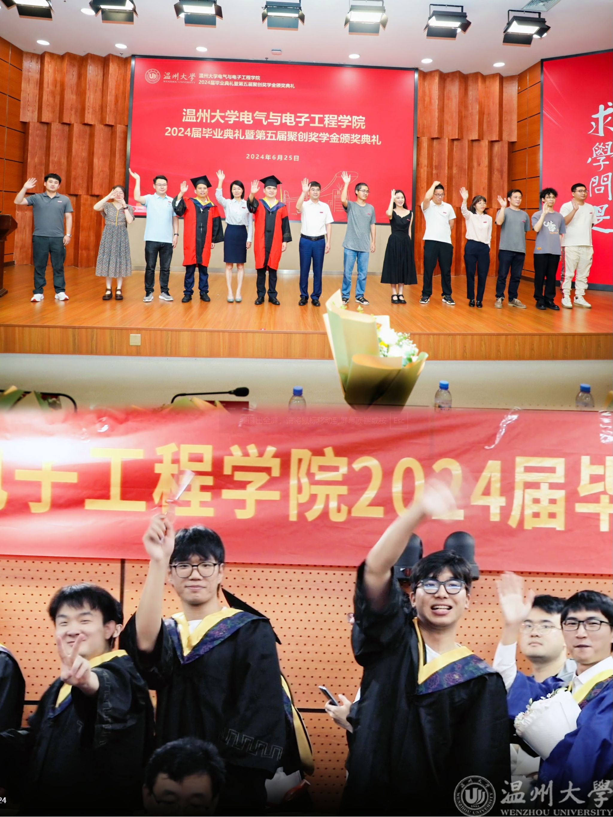 典礼分两阶段进行,在第一阶段,与会师生共同观看黑料网 2024年毕业典礼暨学位授予仪式现场直播;第二阶段为学院毕业典礼暨“聚创奖学金"颁奖仪式。
