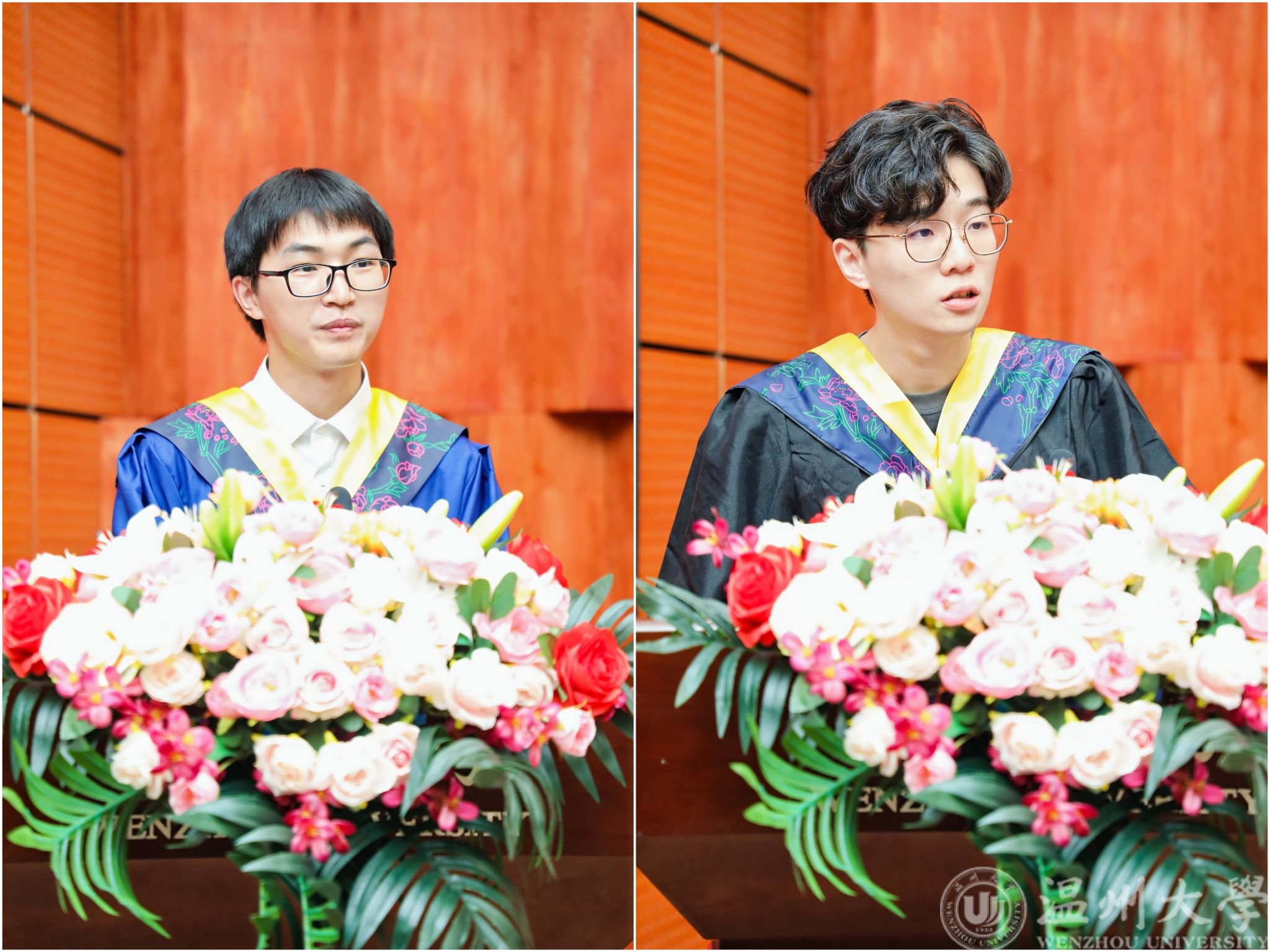 研究生代表刘康和本科生代表史贽豪分别上台发言。他们用自己的亲身经历和感悟,讲述了在校学习和生活经历。他们的发言中充满了对母校的眷恋和对未来的憧憬,表达了对母校、母院的感激之情,也分享了自己对未来的规划和梦想。