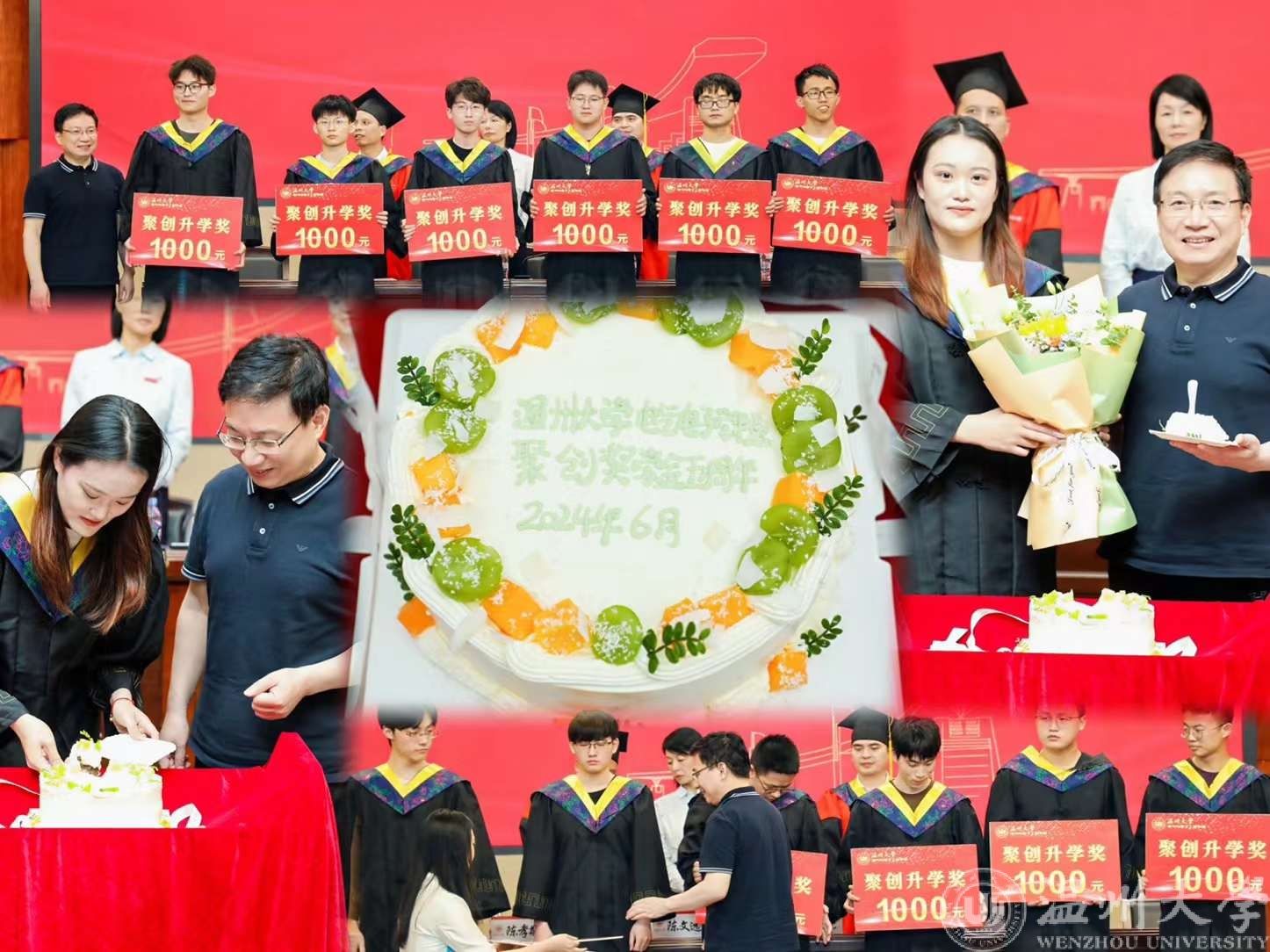 今年是学院“聚创奖学金”设立五周年,张文沛同学作为学生代表与吴桂初教授共同分享了五周年纪念蛋糕,并向吴桂初教授献花表达感谢。