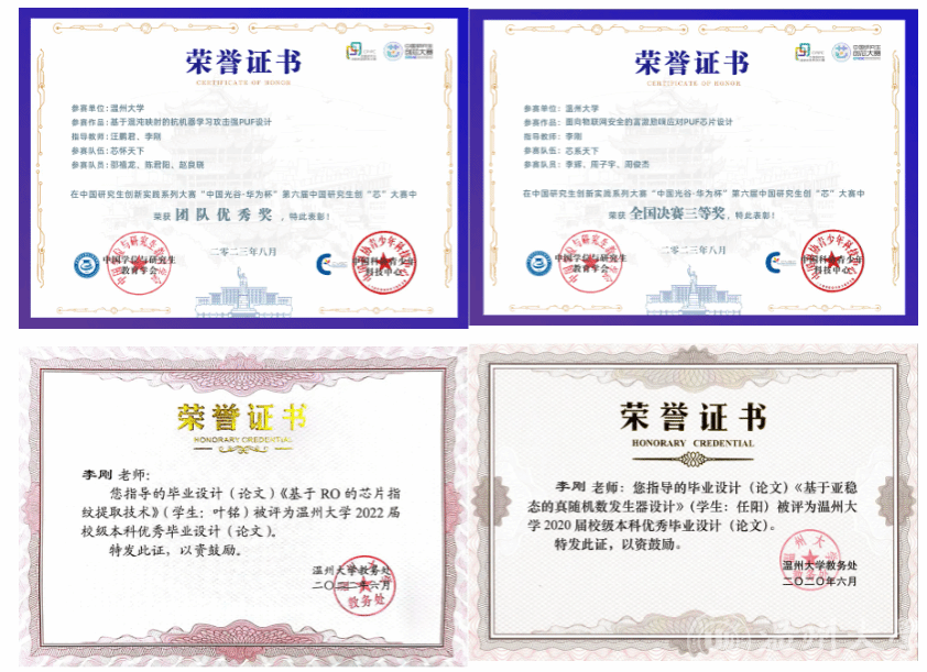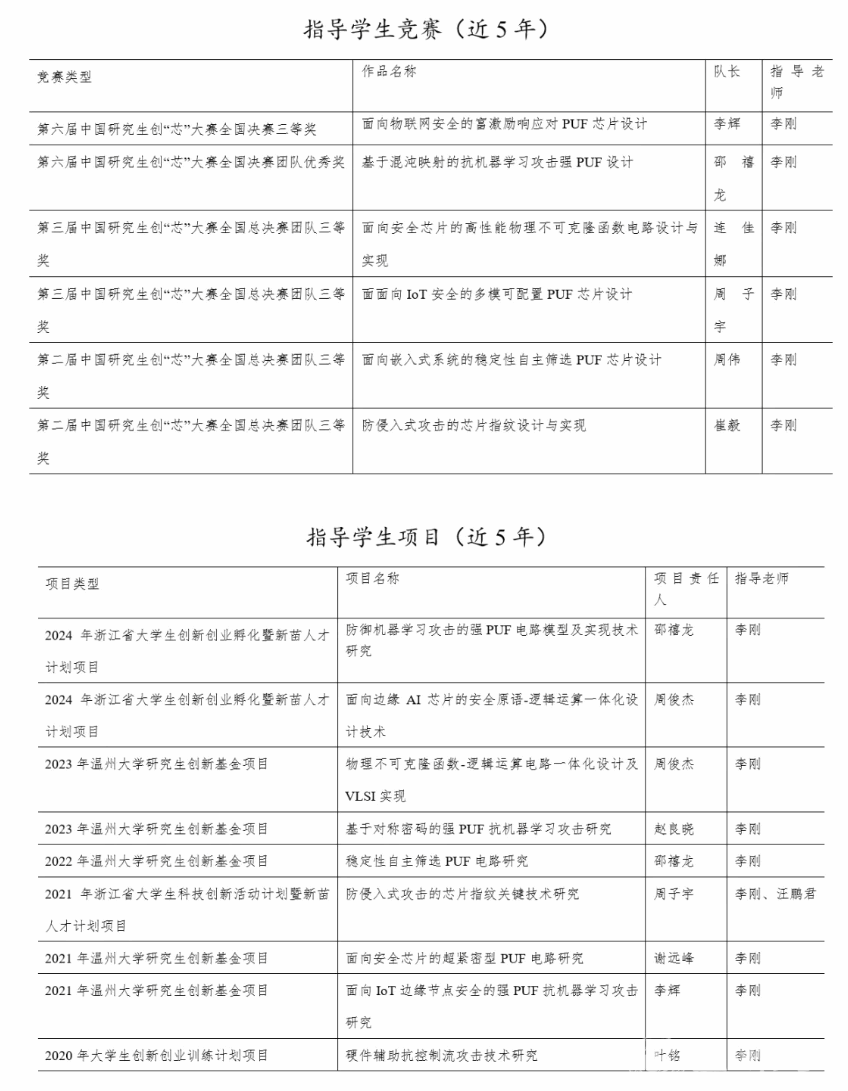 近5年指导学生获浙江省“新苗计划”项目、“大学生创新创业训练计划”项目和“研究生创新基金”项目共9项,指导研究生获得中国研究生创“芯”大赛全国决赛三等奖5项、团队优秀奖1项,指导本科优秀毕业论文2篇;所在的集成电路与智能系统导研团队荣获黑料网 第一批“五好”导研团队。