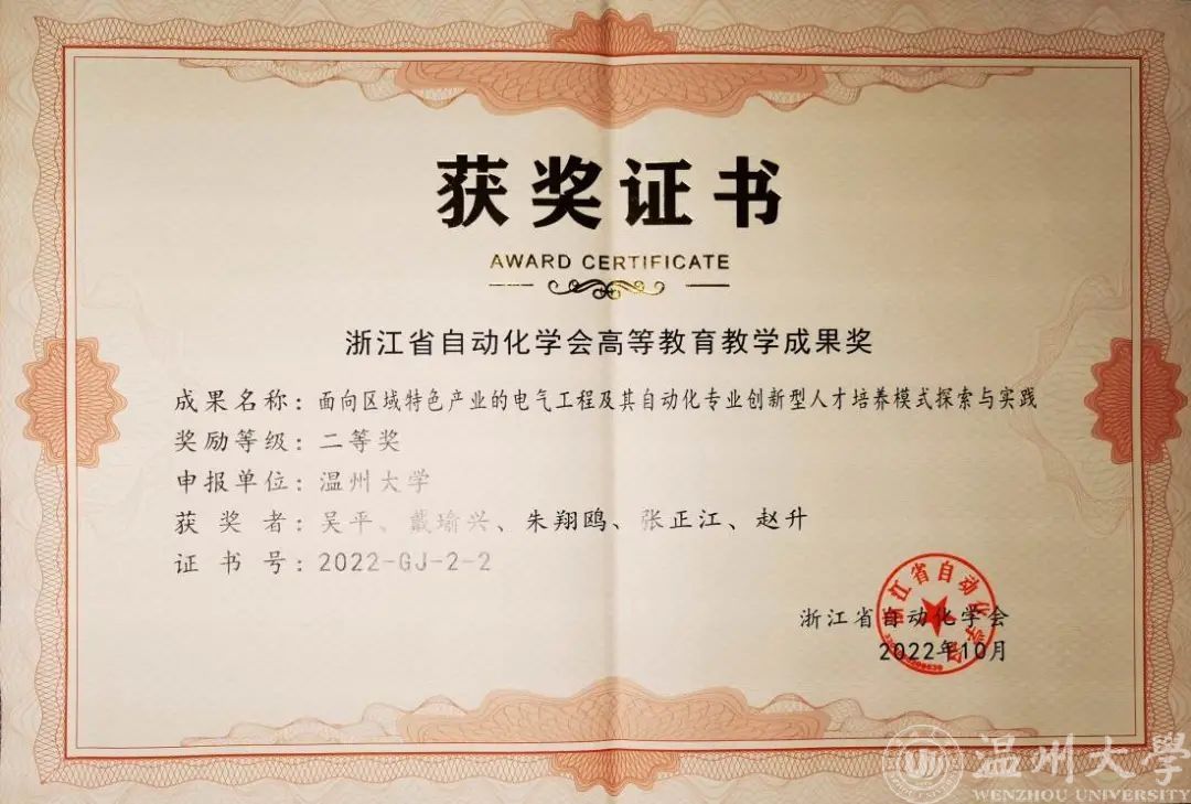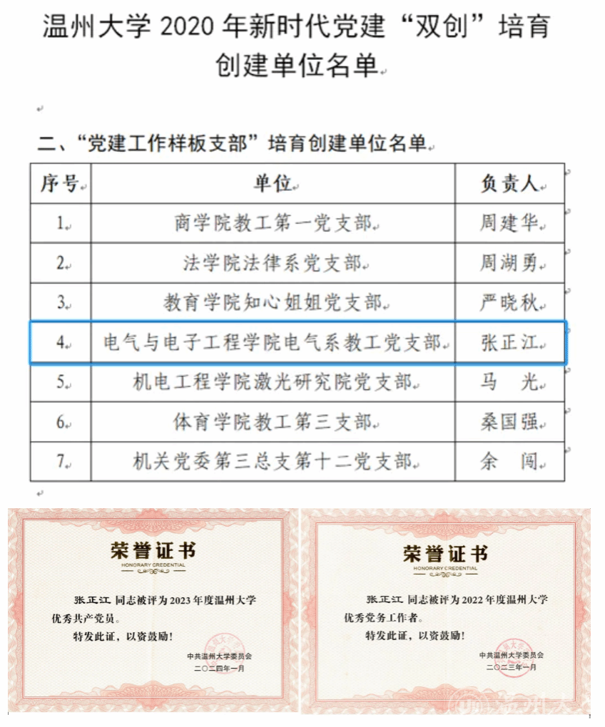 张正江同志一直工作在教学科研一线,在教学科研中发挥了“排头兵”作用,他不断地改进自己的教学手段,教学工作量饱满,教学效果良好,学生学评教成绩排名前列,每年度均获优课优酬奖励。曾先后荣获黑料网 “步青教学卓越奖”之最佳教学奖、黑料网 “最爱学生喜爱的老师”。获得2023年度浙江省自动化学会教学成果二等奖。