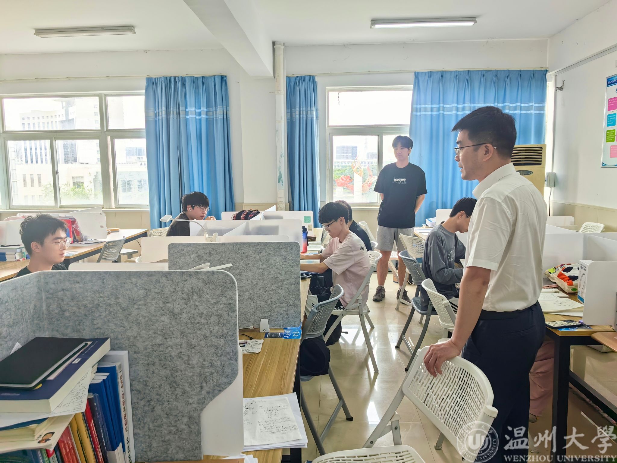 七月盛夏,正值考研备战的关键时期。为了解暑期留校备考研究生考试以及国家电网、公务员招聘考试学生的思想学习生活情况,激励学子把握暑期备考黄金时期,增强迎考信心,7月15日下午14:00,学院党委副书记王中对、学工办辅导员陈海彤、余明新走进学院316和318考研自习室,对留校备考的学子进行慰问。