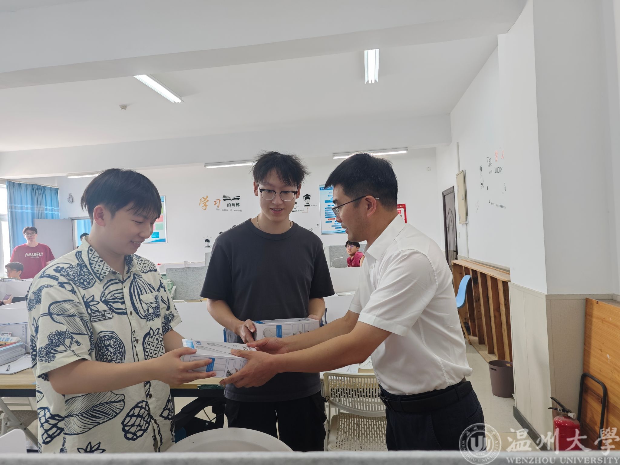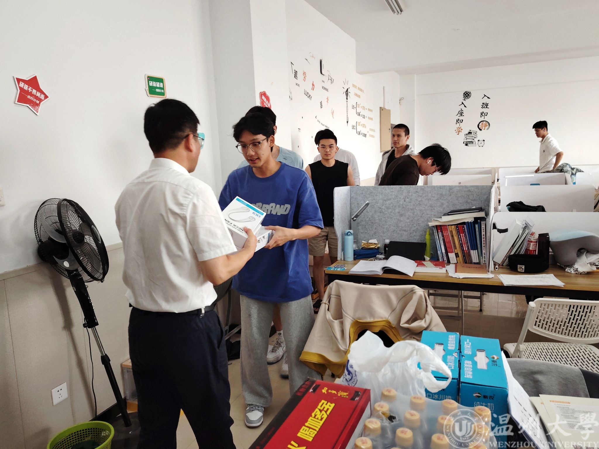 随后,王中对副书记、辅导员陈海彤和余明新为同学们分发学院精心准备的慰问礼品——轻便实用的挂脖电风扇,为学子们在闷热的复习环境中送去缕缕凉风;解暑饮品搭配奥利奥饼干,在炎炎夏日里增添了丝丝甘甜与动力。收到慰问品的学生们脸上洋溢着感激与惊喜的笑容,纷纷表示这样的关怀让他们倍感温暖,更加坚定了备考的决心。