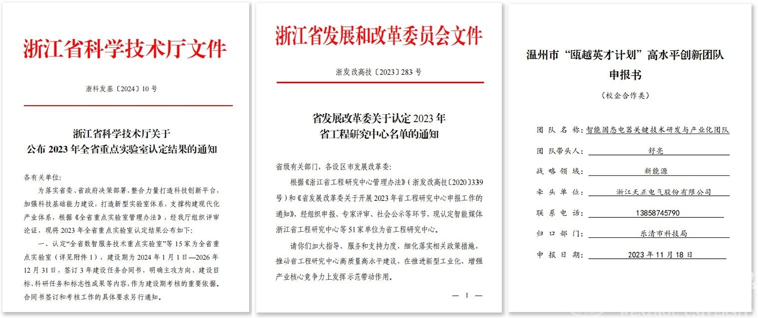 聚焦智能电气、新能源产业技术前沿,以舒亮教授为主任与团队负责人,牵头联合正泰电器等单位共建“全省低压电器智能化与新能源应用重点实验室”,获得省科技厅认定。联合正泰电器共建“低压智能电气及先进制造技术浙江省工程研究中心”,获得省发展改革委认定。以舒亮教授为省重点实验室团队领衔人,联合天正科研团队共建的“智能固态电器关键技术研发与产业化团队”获温州市委组织部认定温州市“瓯越英才计划”高水平创新团队。
