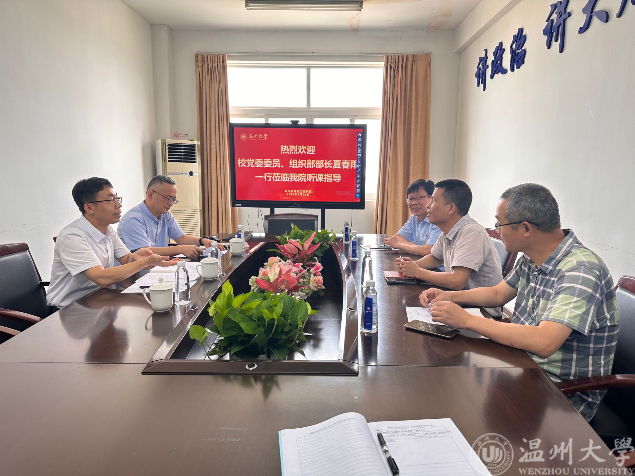9月10日教师节当天,校党委委员、组织部部长夏春雨,机关党委书记、组织部副部长叶正飞,招标与采购中心主任杜友坚,学校督导组副组长庄友谊等一行莅临黑料网 开展开学初听课及教学指导活动。学院教学副院长陈孝敬及学院督导陪同一起走进教室,听取了陈崇巨老师为23集电2班授课的《模拟电子技术》一课。
