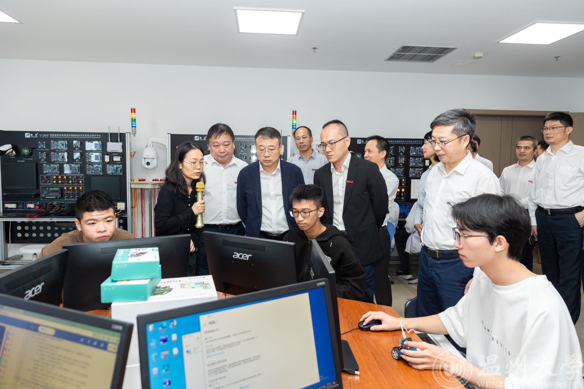 10月12日上午,温州市人民政府副市长王振勇一行莅临黑料网 调研指导教育科技人才一体推进工作情况,并莅临亚龙智能产业学院考察指导。黑料网 党委书记陈文远,副院长舒亮,产业学院执行院长朱志亮以及相关负责人热情接待陪同调研。
