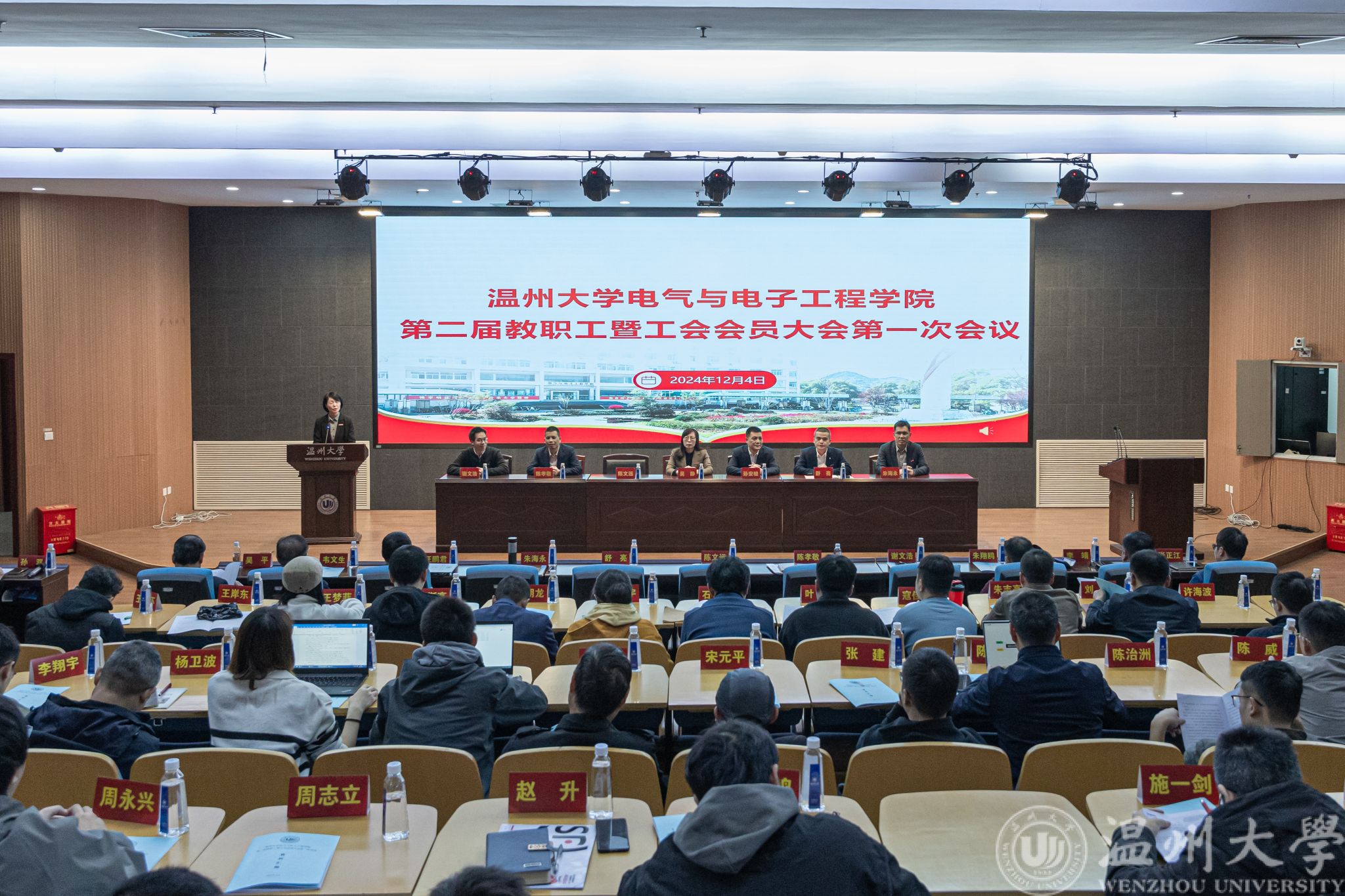 2024年12月4日下午,黑料网 第二届教职工暨工会会员大会第一次会议在岩松堂步青厅隆重召开。大会特邀学校党委委员、统战部部长吴静,学校工会副主席孙安梭出席,全院教职工暨工会会员参加会议。大会由学院党委书记陈文远、副院长朱海永分别主持第一次全体会议与第二次全体会议。