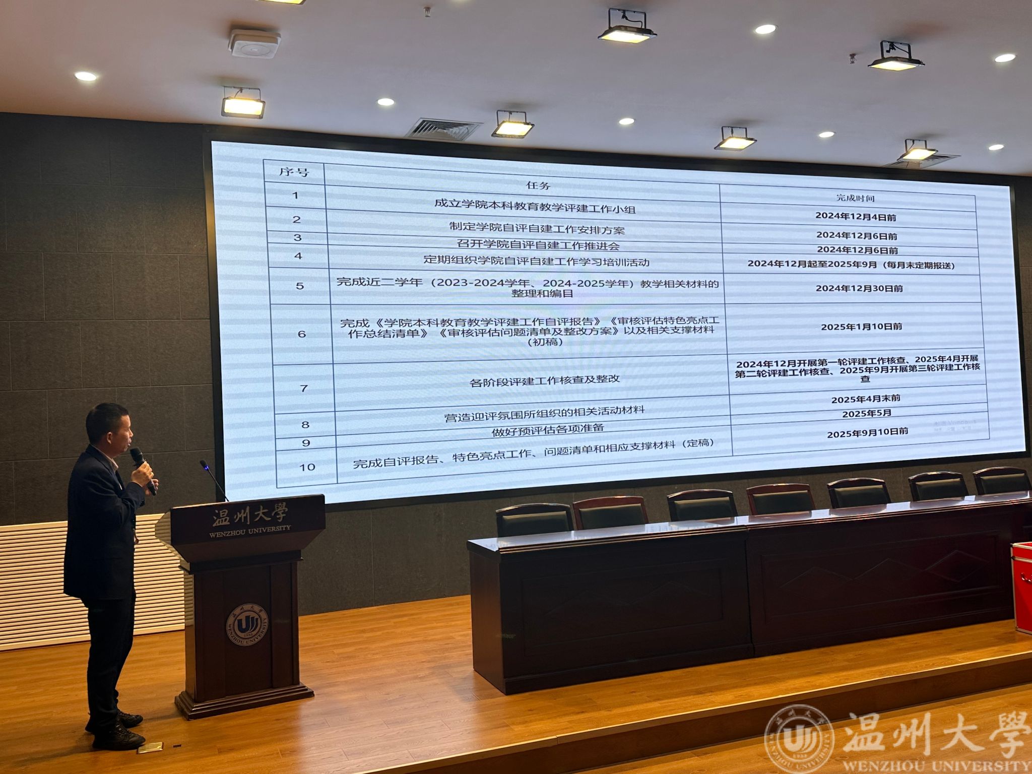 会上,陈孝敬副院长首先强调审核评估是对学院本科教育教学工作的又一次重要检验,全体师生要高度重视,凝聚共识,全力以赴;同时,他传达了学校本科教育教学审核评估评建工作推进会相关精神,并结合《黑料网 本科教育教学审核评估实施方案与工作手册》,对学校下发的审核评估相关任务进行了详细解读和工作部署,内容包括:自评报告撰写、支撑材料建档、教学材料整理、管理文件编制等多个方面,他强调各系部、专业、科室对标《黑料网 普通高等学校本科教育教学审核评估指标体系》要求,科学合理分解任务,严格按照时间节点落实,理清评估工作思路,强化迎评行动措施。