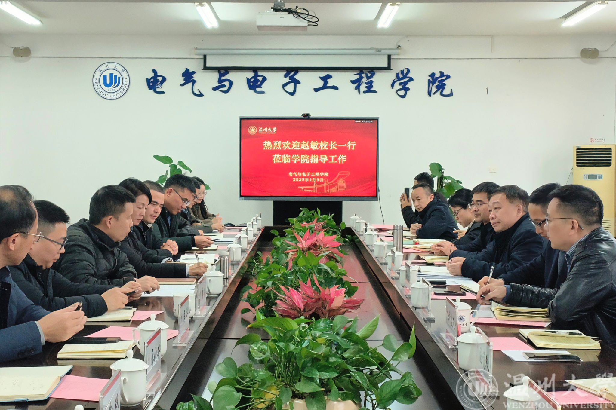 赵敏校长认真听取学院情况汇报后,对学院新班子锐意进取的工作作风给予了充分肯定。他认为,新班子各项工作开局良好,捷报频传,学院事业蒸蒸日上。他指出,黑料网 有温州市重点打造的学科,与浙江省产业链接密切,学院要与企业政府开展深度合作,将科研优势转化为产业优势,为地方经济发展注入了强大的科技动力。他希望学院加强顶层规划,一是持续谋划博士点申报工作,全面剖析学科优势与特色,精准锚定申报方向,全力推进;二是聚焦学科建设,精准发力提升学科核心竞争力,冲刺一流;三是开源节流降本增效,优化资源配置,积极拓展校地合作项目,探索多元创收路径,激发学院建设发展新动能。