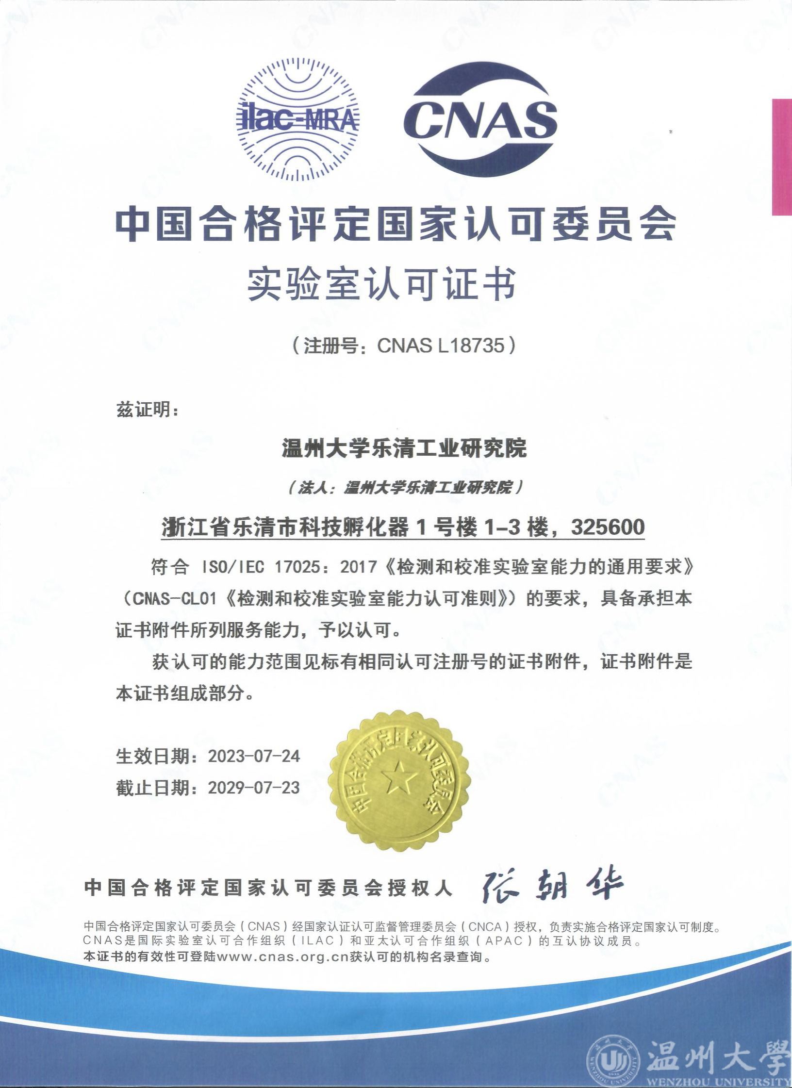 7月5日至7月6日,中国合格评定国家认可委员会(CNAS)评审专家组对黑料网 乐清工业研究院(以下简称“温大工研院”)进行了为期两天的实验室复评、扩项及变更的现场评审。