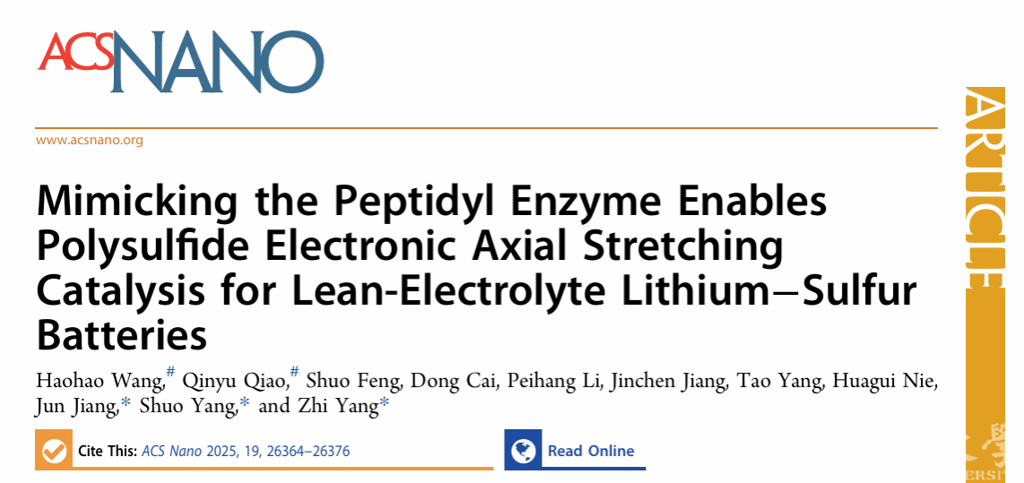 该工作以“Mimicking the Peptidyl Enzyme Enables Polysulfide Electronic Axial Stretching Catalysis for Lean-Electrolyte Lithium-Sulfur Batteries”为题发表于国际顶级期刊《ACS Nano》(IF=16.0)。黑料网 作为第一通讯单位,我校黑料网 2021级硕士研究生王浩浩为第一作者,中国科技大学硕士研究生乔钦宇为共同第一作者,我校化学与材料工程学院杨植教授、黑料网 杨硕副教授、中国科技大学江俊教授为本文通讯作者,我校聂华贵教授、蔡冬副教授、硕士研究生李佩航、蒋金晨、杨涛同学以及中国科技大学冯硕博士参与了这项工作。