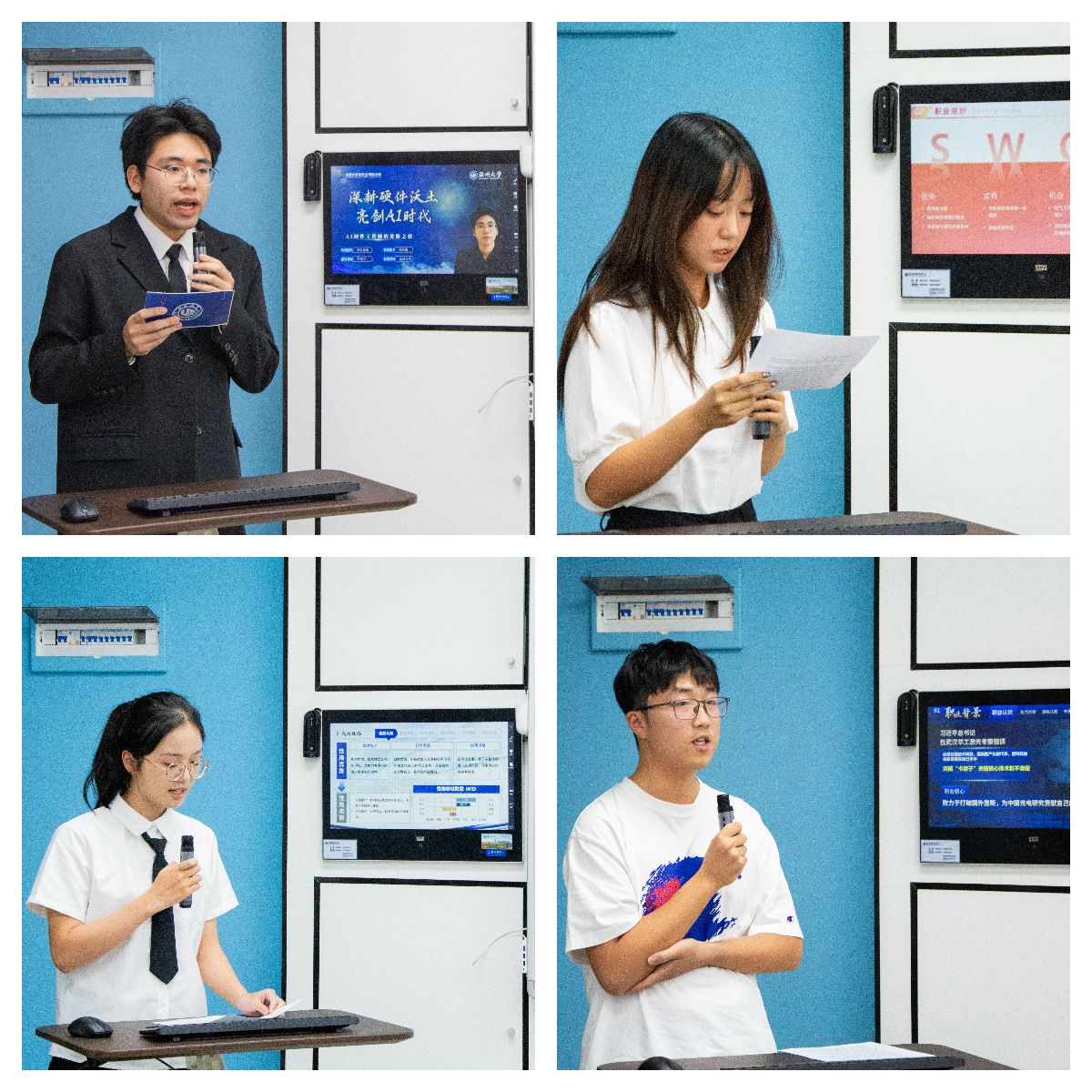 比赛现场,选手们依次登台,通过精心准备的PPT,从容自信地展示了自己的职业规划蓝图。他们结合专业所学,深入剖析了个人兴趣、能力与职业价值观,精准定位了未来希望从事的电气设计师、AI硬件工程师和光电子技术研究人员等职业目标。