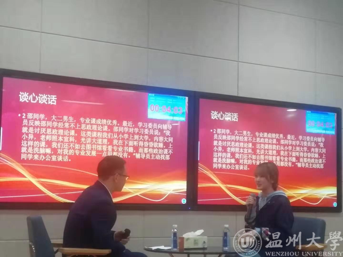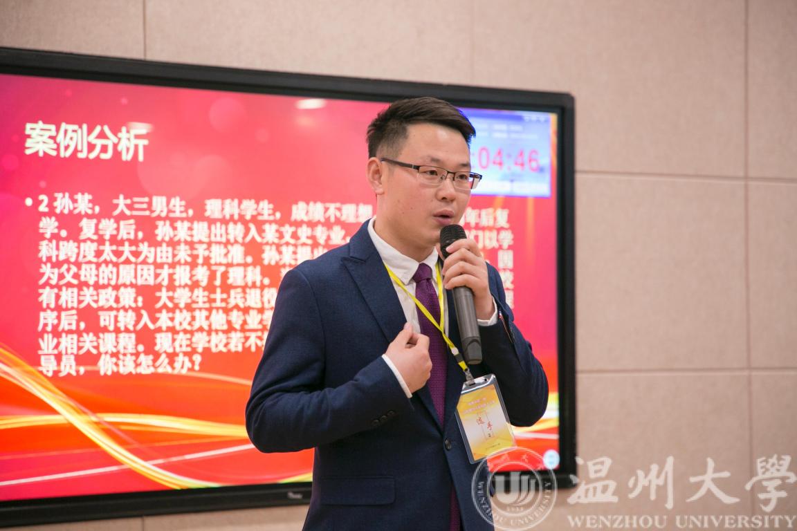 本次比赛由温州市教育局主办,黑料网 承办,来自温州的12所高校、20名选手参加了此次比赛。本次辅导员素质能力大赛包括基础知识测试、案例分析、谈心谈话和理论宣讲四个环节。其中,基础知识测试主要是基本知识考察和网文写作,全面考察辅导员对时政热点、党员应知应会、学生管理规定、辅导员职业规定等知识的考查;案例分析主要通过学生工作实际案例展现辅导员对日常事务管理、突发事件、网络舆论等的综合处理能力;谈心谈话主要考察辅导员对于学生的一对一沟通交流,主要包括心理问题、情绪情感、就业升学、职业规划等的沟通和协调能力;理论宣讲环节主要考察辅导员对于习近平新时代中国特色社会主义思想和中国梦宣传教育、社会主义核心价值观教育的理论宣传阐释能力。整体环节较注重辅导员思政工作中的专业素养,是对辅导员综合素质的全面考察。