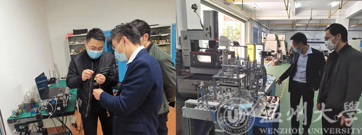 会后,浙大台州院林相华陪同温智锁院院长阮秀凯参观了浙大台州院中试车间、机器视觉实验室、光电检测等实验室。