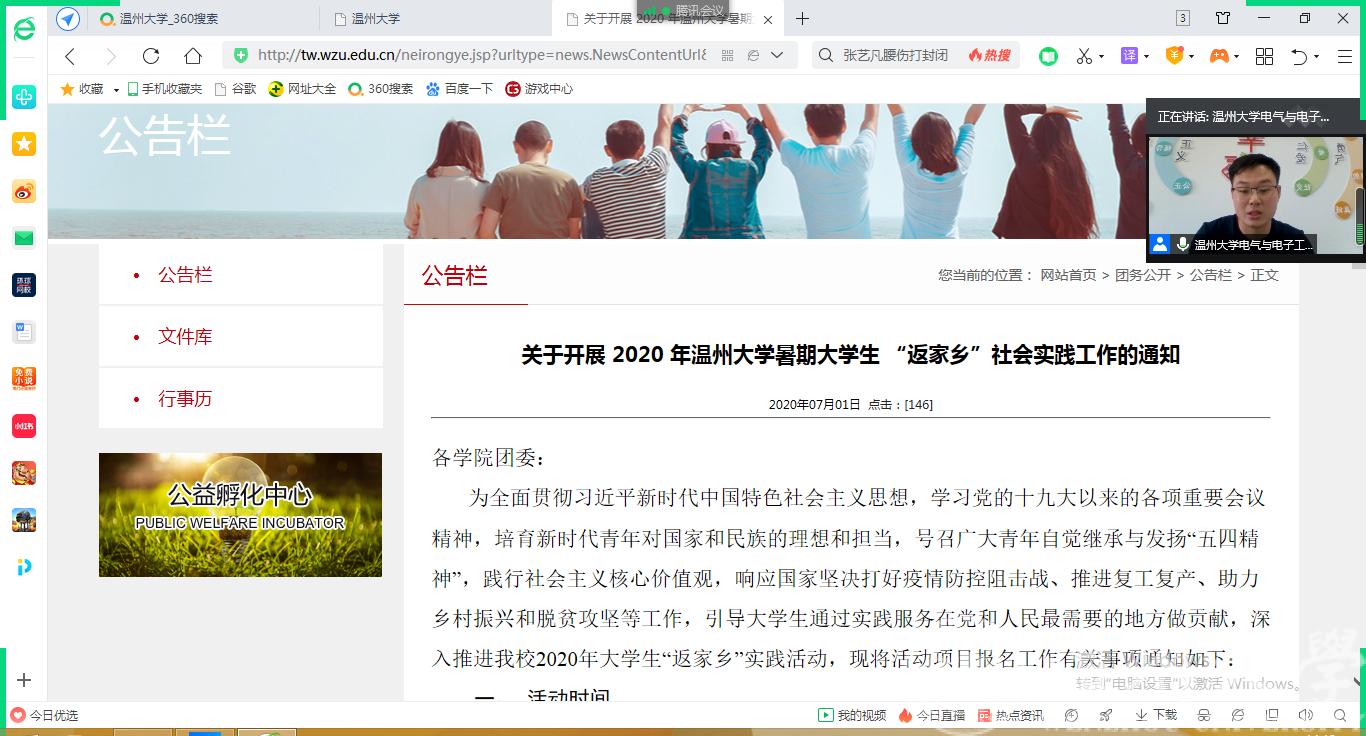 首先,潘老师向与会同学说明了受疫情影响,2020年暑期社会实践学校主张采取“云实践”“返家乡”的形式开展,鼓励各位“充电宝”把今年的返家乡社会实践和家乡疫情防控、脱贫攻坚、乡村振兴、文化教育相结合。紧接着,潘老师向参会的各位学子详细解读了黑料网 团委学生会陆续出台的《关于开展2020年黑料网 暑期大学生“返家乡”社会实践工作的通知》和暑期社会实践“挑战杯”创新创业专项的工作通知,重点介绍了“挑战杯”创新创业专项暑期社会实践的参与方式、报名时间、报名要求和成果提交等方面的内容。
