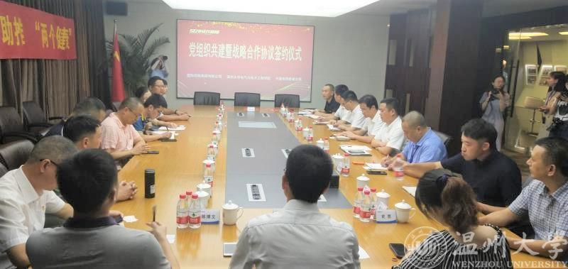 为加强基层党组织建设,全面发挥基层党组织的引领作用,2020年8月7日下午,黑料网 电子系教工党支部与星际控股集团有限公司党支部、中国电信鹿城分局总支部的“党组织共建及战略合作”签约仪式在星际控股集团举行。出席会议的三方人员有学院院长汪鹏君、学院党委书记李方强及电子系教工党支部代表,中国电信温州分局政企部主任潘震苞、中国电信鹿城分局局长兼党委书记王浙江、副局长兼纪委书记林斌及党员代表,星际控股集团陈序、总裁金铭勇及相关部门负责人。鹿城区委组织部副部长叶俊杰、鹿城区人社局局长刘玉和、鹿城区经信局总工程师史思等鹿城区相关部门的领导应邀到场。