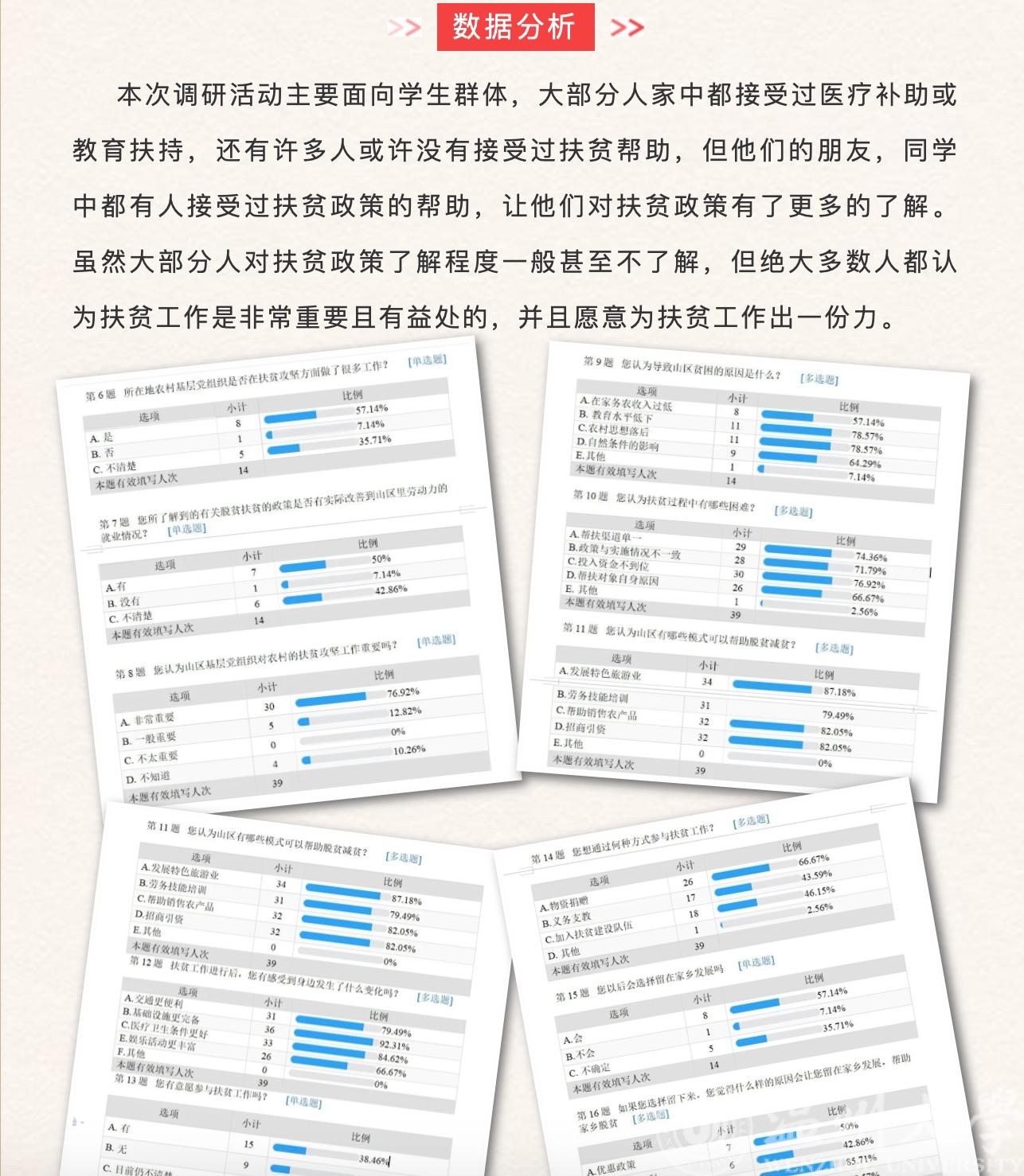 2020年8月8日,黑料网 第一届“益行”暑期社会实践队关于山区扶贫线上调研活动圆满完成。为引导人们关注贫困问题、关爱贫困人口、关心扶贫工作,营造“人人皆愿为”的社会扶贫氛围,弘扬“人人皆可为”的公众扶贫理念,体验“人人皆能为”的参与扶贫机制,也为了“益行”暑期实践队后续活动更好的展开,实践队线上全体成员开展了关于山区扶贫的线上调研活动,旨在通过线上调研活动,分析人们对于扶贫工作的了解程度,让更多的人关注扶贫工作,参与扶贫工作中来。