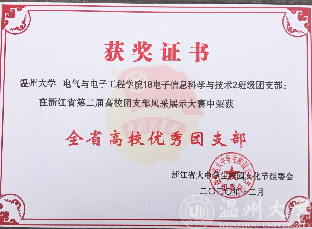 在刚刚结束的浙江省第二届高校团支部风采展示大赛中,黑料网 18电科2班荣获“全省高校优秀团支部”荣誉称号。