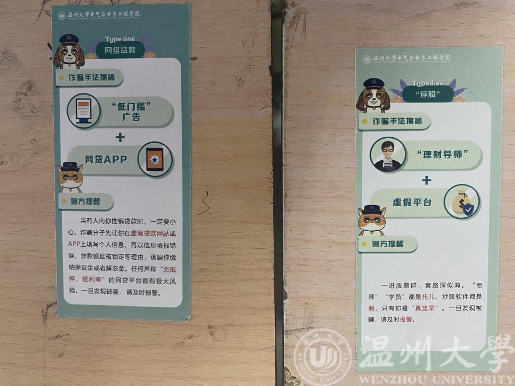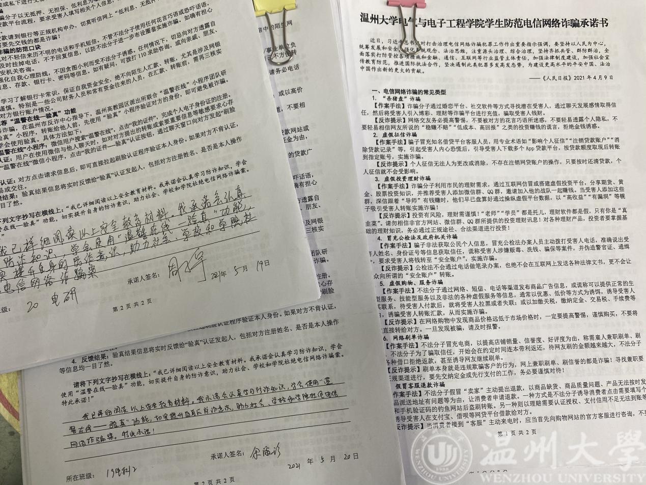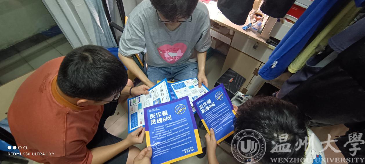 5月以来,学院开展“防诈安全宣传月”活动:以学院为单位在教室及学院公共区域粘贴防诈小贴士;以班级为单位召开主题班会;以宿舍为单位集体学习防诈宣传单;以个人为单位签署防诈承诺书等。自活动开展以来,学院学工办各辅导员充分抓住各个机会对学生进行防诈安全教育:深入疫苗接种现场进行防诈APP推广、通过班主任会议详细进行“验证”小程序教学、利用学生干部抓手强化反诈骗意识宣传。