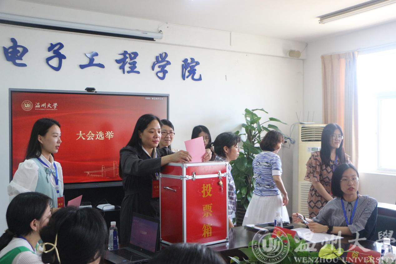会议选举产生了学院妇女联合会第一届执委会以及主席、副主席,户新宇、孙双、杨硕、励雯、曾蓓蕾等5名师生当选电气电子学院妇联第一届执委会委员,曾蓓蕾当选为电气电子学院妇联第一届执委会主席、杨硕当选为第一届执委会副主席。