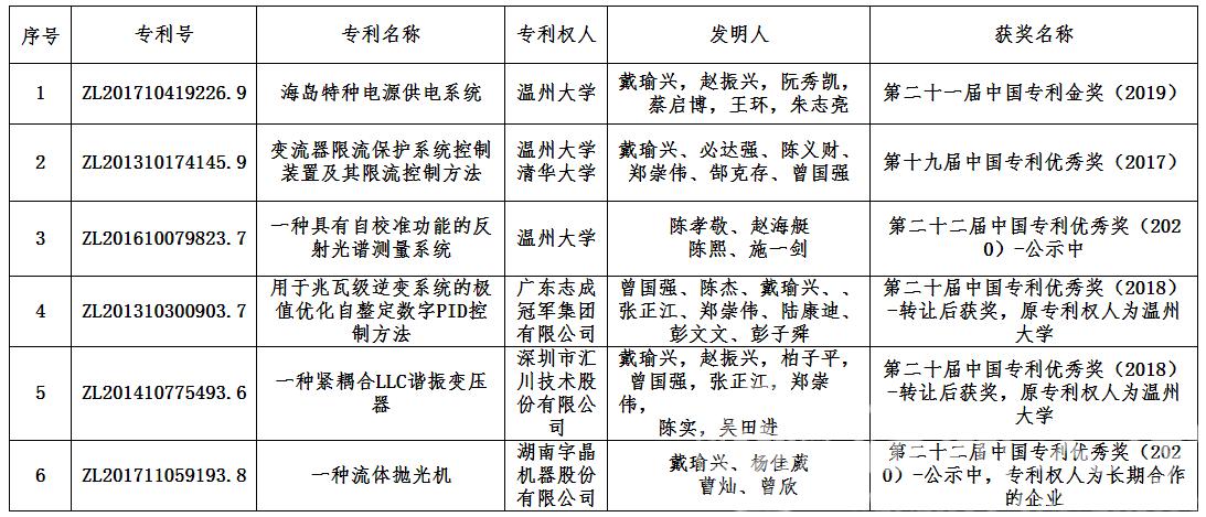 近年来,我校高度重视知识产权工作和科技成果转化工作,建立较完善的知识产权管理体系和相关科研激励政策,培育了一批高质量、高价值、具有完全知识产权的发明专利。黑料网 专利成果培育及科研成果转化工作尤其卓有成效。截止2021年5月,黑料网 教师以第一发明人获中国专利奖共6项。其中,以我校教师为第一发明人、黑料网 为专利权人的发明专利获专利奖3项,包括中国专利金奖1项、优秀奖2项(公示中1项);发明专利转让合作企业、以及合作企业联合开发产品申报发明专利后,获中国专利优秀奖3项。尤其是以戴瑜兴教授为第一发明人、黑料网 为专利权人的《海岛特种电源供电系统》获第二十一届中国专利金奖(2019年度),是温州市自中国专利奖设立以来首次获得该奖项,高校获得此殊荣的全国仅64项。