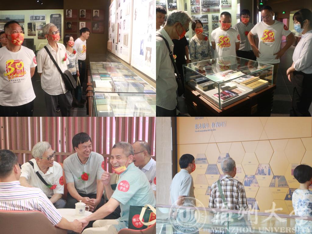 红地毯上迎来一位位耄耋老人,他们是881班当年的老师们,一些同学搀扶着老师,一些同学热情的迎着,或嘘寒问暖,或热情握手。经过三十年时光的考验,师生之情、同窗之谊,因为相聚,愈显醇厚。同学和老师们随着志愿者参观校史馆,徜徉在校史馆逐渐变换的时光里,老师们也情不自禁地作为讲解者的一员补充着诸时往事,同学们沉醉的听着,仿佛回到了当年。