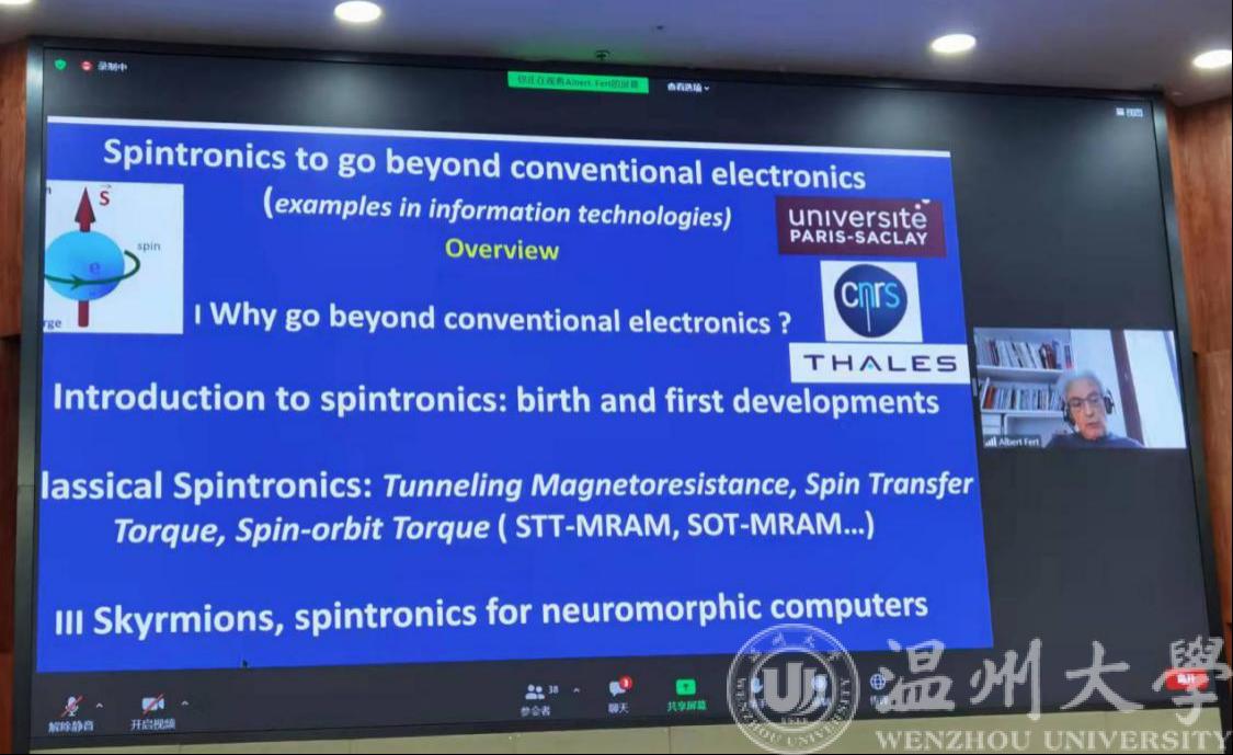 2021年10月25日下午,2021年世界青年科学家峰会科学大使活动费尔教授诺奖报告会在我校岩松堂雁山厅举行。本次报告会,以我校为主会场,北京航空航天大学、浙江大学为分会场,采用现场会议+视频联线仪式,通过线上线下结合形式举行。我校黑料网 负责主会场活动。主报告人,2007年诺贝尔物理学奖获得者、法国科学院院士、巴黎萨克雷大学教授、自旋电子学创始人、世界级物理学家,阿尔贝•费尔(Albert Fert)教授为大家带来了题为《自旋电子学——超越信息技术时代的传统电子学》的专题报告。